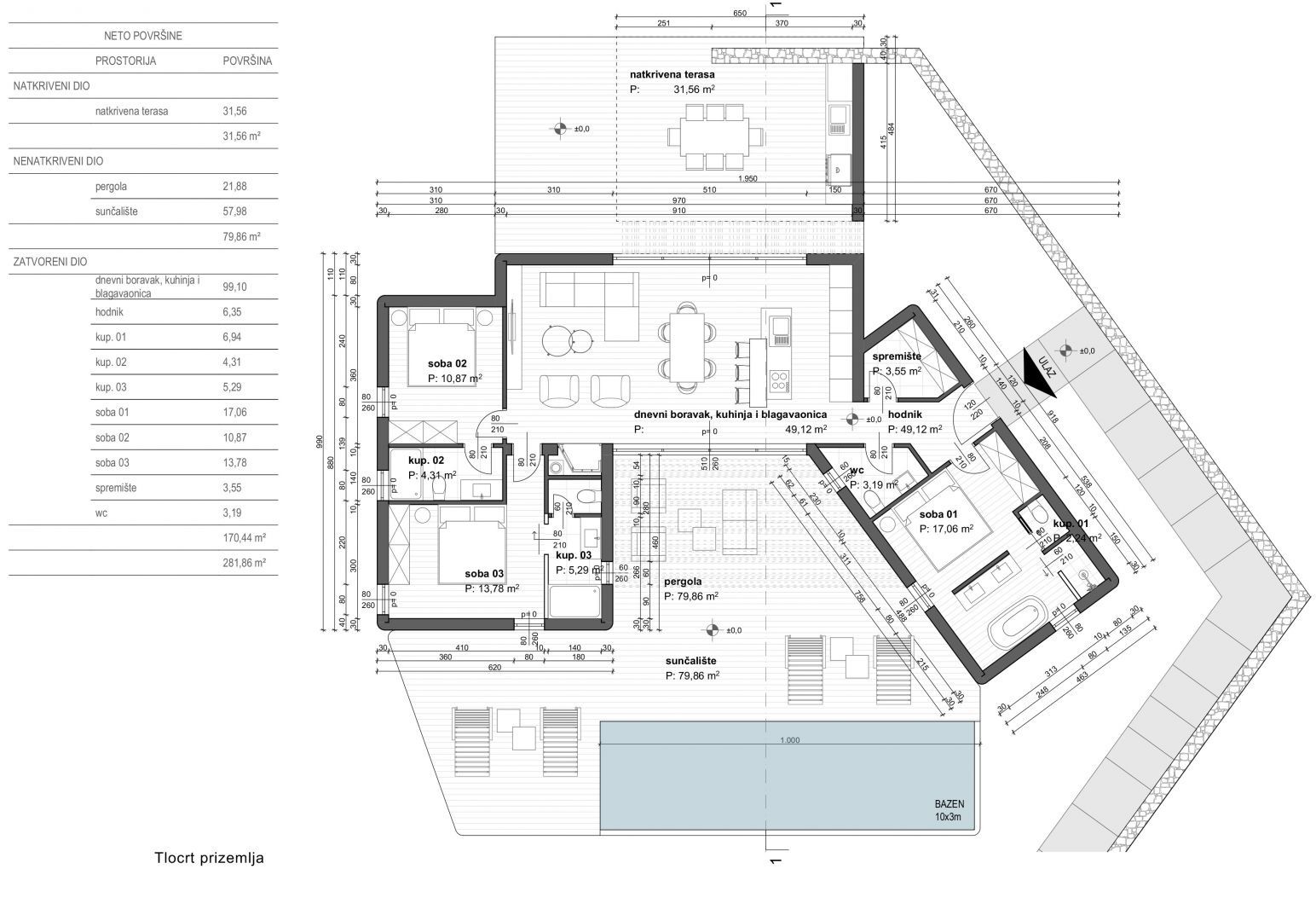 OSTROV KRK, LINARDIĆI - Luxusní moderní přízemní dům s bazénem a výhledem na moře Vila má jedinečný, moderní design a nachází se na pozemku o rozloze 700 m2. Plocha přízemního domu je 135 m2 a skládá se ze tří ložnic, každá s vlastní koupelnou, velkého obývacího pokoje, jídelny a kuchyně, chodby, úložné místnosti a toalety pro hosty a velké kryté terasy o rozloze 32 m2. Na zahradě se nachází také bazén o rozloze 30 m2 s prostorem na opalování, několika parkovacími místy a krytou zónou pro společenské akce s letní kuchyní a grilem. Zahrada je upravená a zdobená středomořskými rostlinami. Strojovna bazénu se nachází v suterénu a má stojatou výšku. Tato fantastická nemovitost, kromě toho, že je moderně navržena a jedinečná, je orientována na jih, nachází se na okraji zelené zóny a má otevřený výhled na moře. Další výhodou domu je vysoce kvalitní konstrukce, vybavení špičkovými materiály a zařízeními, vestavěné podlahové vytápění po celé ploše. Tesařské práce jsou z PVC, má vnitřní krb a každá místnost má vlastní klimatizaci. Prodává se kompletně zařízený. Dokumentace je v pořádku, vlastnictví bez věcných břemen. Převod na nového majitele je možný ihned. PŘÍLEŽITOST NA KRKU! Kontaktujte nás, domluvte si prohlídku a přijďte si užít klid, pohodu a soukromou malou oázu na ostrově! ***