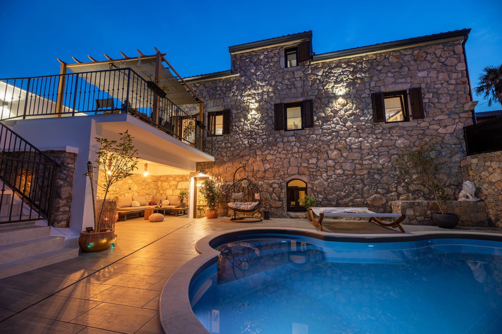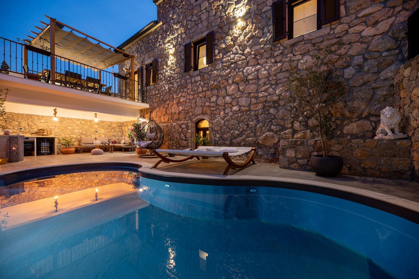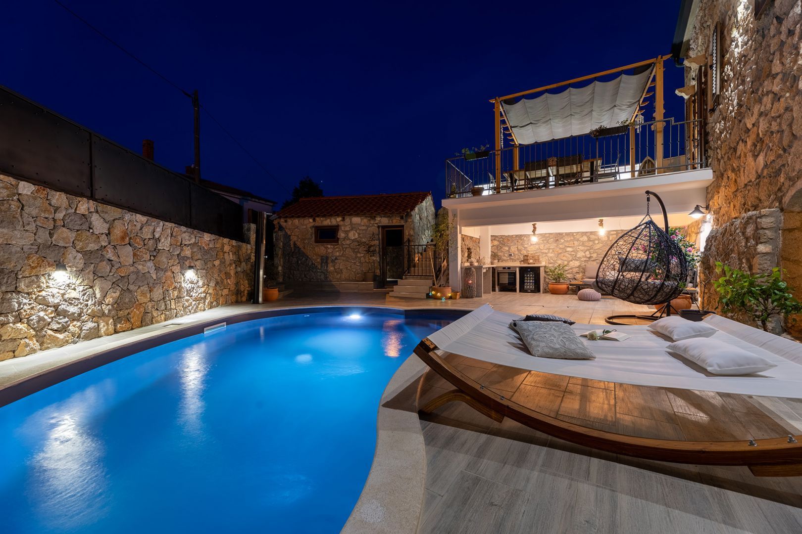 Ostrov Krk - Luxusní kamenná vila s bazénem, jen 1500 m od moře V přízemí budovy se nachází taverna, kde můžete strávit příjemné chvíle s přáteli při kulečníku nebo šipkách, ve vedlejší místnosti je sauna a posilovna. Z velké terasy v prvním patře se vchází do obývacího pokoje, kuchyně s jídelnou, koupelny a ložnice. Vnitřní schodiště vede do druhého patra, kde je kromě galerie obývací pokoj, dvě ložnice, koupelna a krásná terasa. Na oploceném dvoře se nachází bazén, prostor na slunění se sprchou a gril. Tato krásná budova má čtyři parkovací místa. Pokud hledáte klid a skutečný odpočinek, je toto zařízení to pravé pro vás. Na východní straně ostrova Krk se nachází obec Dobrinj se stejnojmenným centrem. Dobrinj se nachází na kopci vysokém asi 200 metrů a je jedním ze středověkých hradů, které byly v minulosti centry gramotnosti. Dobrinjština byla po staletí mimořádně zemědělskou oblastí. Zastoupen byl také chov zvířat a pěstování oliv a využívání lesních zdrojů. Místo je také známé svými pestrými lidovými kroji, folklorními akcemi, školou sopela (krkský dechový nástroj) a tradiční místní kuchyní. V tomto ostrovním centru převažují autochtonní kamenné domy a úzké kamenné uličky, které připomínají minulost. Nedaleko Dobrinje je jeskyně Biserujka, která potěší svou krásou a zajímavými vysráženými formami. Je to jediná jeskyně na ostrově, kterých je více než 50, určená k přijímání návštěvníků. Podle pověsti byla jeskyně pojmenována Biserujka (perla) podle nalezeného pokladu, který patřil místním pirátům.