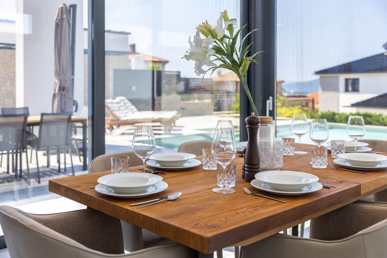 OSTROV KRK - prestižní novostavba s výhledem na moře Představujeme vám výjimečnou příležitost - moderní a luxusní vilu na jednom z nejžádanějších míst na ostrově Krk, která nabízí nádherný výhled na moře a dokonalou kombinaci soukromí, elegance a pohodlí. Tato architektonicky bezchybná vila se nachází v klidné, dobře udržované rezidenční čtvrti na pozemku o rozloze 518 m² a vyzařuje sofistikovanost, špičkový design a bezchybnou funkčnost. Je ideální jak pro luxusní rodinný život, tak i jako špičková investice do elitní turistiky. Pečlivě upravená zahrada nabízí velký nekonečný bazén, prostornou terasu na opalování, krytou terasu s venkovním jídelním koutem a letní kuchyň s grilem. V přízemí najdete prostorný obývací pokoj s panoramatickými prosklenými stěnami, které otevírají výhled na bazén a moře, moderní kuchyň s ostrůvkem a jídelnu. Na stejném patře se nacházejí dvě pohodlné ložnice, každá s vlastní koupelnou a soukromou terasou. První patro vily přináší extra dávku luxusu: obývací pokoj/pracovní kout s rozkládací pohovkou a balkonem s výhledem na les, hlavní ložnici s vanou, luxusní koupelnu a moderní skandinávskou saunu, prostorný balkon s úchvatným výhledem na moře a prostornou šatnu. Vila je postavena podle nejvyšších standardů a vybavena nejmodernější technologií: podlahové vytápění pomocí tepelného čerpadla, klimatizace ve všech místnostech, vysoce kvalitní hliníkové truhlářské výrobky, sofistikované osvětlení a vyhřívaný bazén. Jižní orientace zajišťuje dostatek přirozeného světla po celý den, zatímco panoramatický výhled na Kvarnerský záliv a okolní ostrovy je prostě úchvatný. K dispozici je kryté parkování až pro tři vozidla. Je vzdálena pouhých 2 500 metrů od moře - pět minut jízdy autem nebo příjemná třicetiminutová procházka. Budoucímu majiteli může být poskytnuto kotviště pro lodě v nedalekém přístavu. Letiště Rijeka je vzdálené pouhých 27 km (asi 20 minut jízdy autem). Tato vila není jen domovem - je to životní styl. Kombinace vynikajícího komfortu, moderního designu a jedinečné lokality z ní činí vzácnou příležitost na trhu. Vážení potenciální kupující, těší nás, že máte zájem o nemovitosti z naší nabídky. Pro více informací a domluvu na prohlídce nemovitosti nás neváhejte kontaktovat.