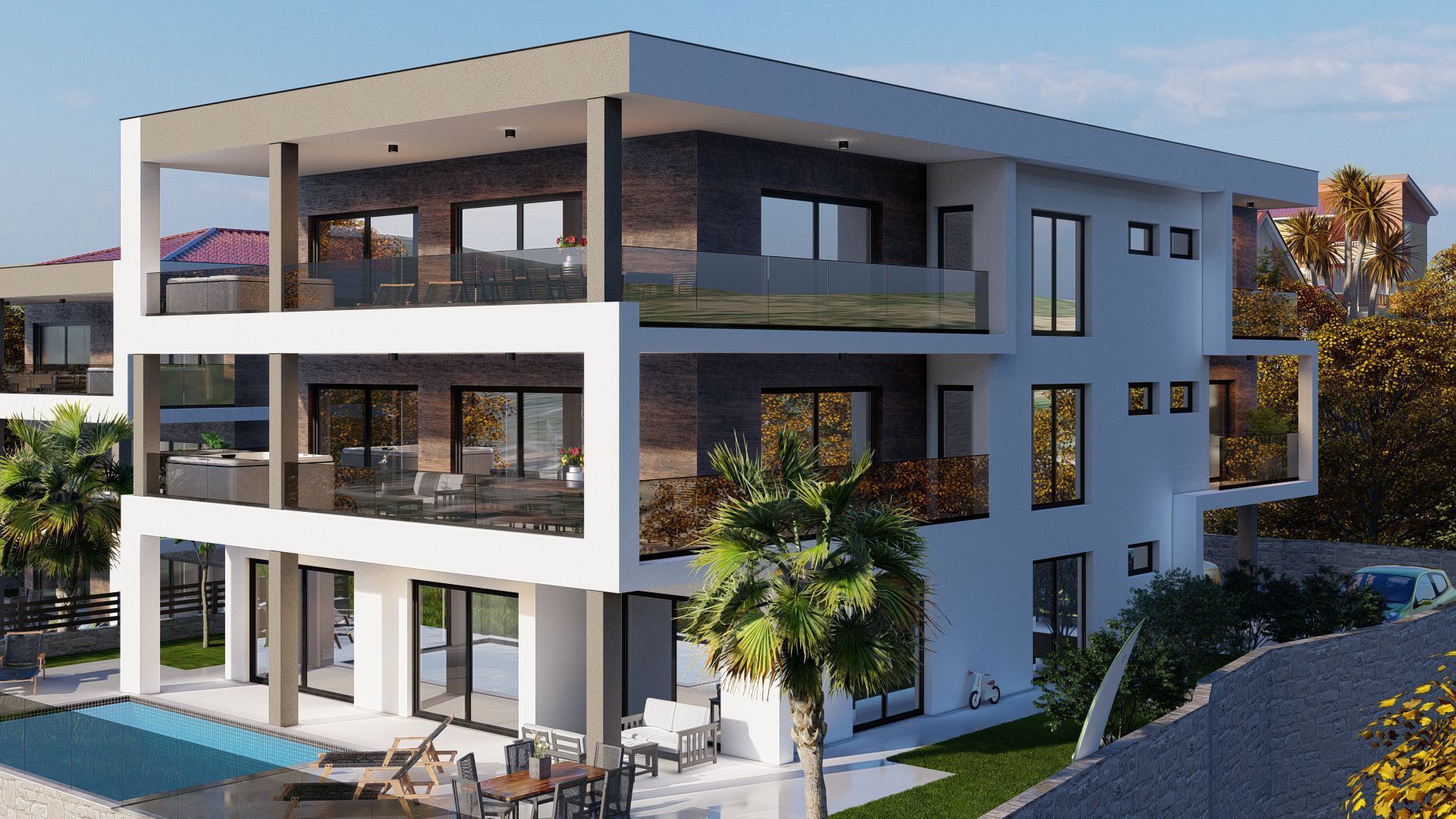 OSTROV KRK, VRBNIK - Luxusní apartmán s bazénem Skládá se ze dvou ložnic, z nichž jedna má vlastní koupelnu a šatnu, další koupelny, obývacího pokoje s kuchyní a jídelnou a prádelny, celková plocha 102,3 m2. Z obývacího pokoje je vstup na zastřešenou terasu a dále do prostoru na slunění a do prostoru kolem bazénu. K bytu náleží komora v suterénu a dvě parkovací stání. Budova má moderní design s výtahem a skládá se pouze ze tří bytů, každý na vlastním patře. Při stavbě jsou použity kvalitní materiály a moderní stavební techniky. VRBNIK je bezesporu jedno z nejznámějších chorvatských míst. A to díky svému hlaholskému dědictví a slavné lidové písni s osobitou melodií a obsahem, která byla interpretována a aranžována v řadě variant Vrbniča nad morem. A Vrbnik, stejně jako ostatní staré hrady na ostrově, se nachází vysoko, ve výšce téměř 50 metrů a na opravdu zvláštním místě na útesu, který se doslova noří do moře. Spolu se Šilo v Dobrinjštině je to jediné větší místo na východním pobřeží ostrova Krk. Poprvé je zmíněn v roce 1100. Obyvatelé se zabývali převážně zemědělstvím, méně mořeplavbou a rybolovem. Dnes je nejznámějším produktem vrbnického pole a Vrbniku vůbec zlatožluté víno - Žlahtina; proslavila se v širším chorvatském měřítku. Podle vyprávění starších místních obyvatel, než se víno proslavilo, se na poli pěstovalo obilí, aby uživilo rodiny, které měly více členů než dnes. V takových podmínkách se vinná réva pěstovala podél okrajů polí, protože tam nebyl trh a víno se vyrábělo jen pro vlastní potřebu. Díky své bohaté historii je Vrbnik nazýván kolébkou chorvatské gramotnosti a je určitě jedním z nejstarších míst na ostrově Krk. Vrbniku dominují úzké uličky, a tak není divu, že se zde nachází nejužší ulička na světě.