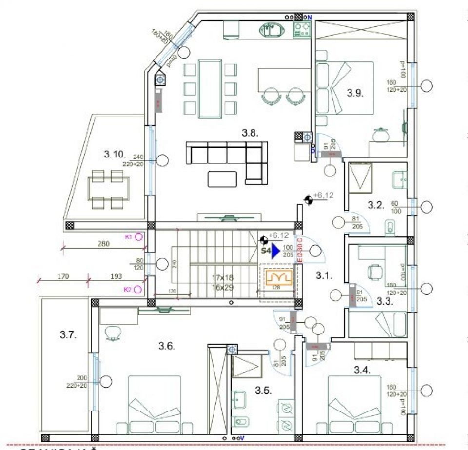 PRODAJE SE STAN S 4 SPAVAĆE SOBE – STAN 4, PULA Na prodej je byt o rozloze 117,01 m2 ve 2. patře (Byt 4) v moderní novostavbě se celkem 4 bytovými jednotkami, umístěné na klidné lokalitě v Pule. Byt se nachází ve 2. patře kvalitně navržené menší bytové budovy, což zajišťuje klid, soukromí a malý počet sousedů. Budova má moderní design s plochou střechou a funkčním uspořádáním. Byt zahrnuje předsíň, 4 ložnice, 2 koupelny, kuchyň s obývacím pokojem a jídelnou a 2 zastřešené terasy. Tato nemovitost je zvlášť vhodná pro rodiny nebo jako investice pro dlouhodobý pronájem. Lokalita: Nemovitost se nachází v klidném obytném prostředí s dobrou dopravní dostupností a v blízkosti všech potřebných služeb, jako jsou obchody, školy a další infrastruktura.