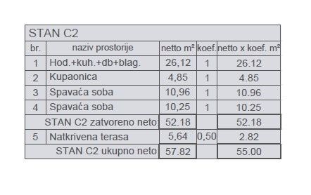 Prodáváme krásný byt v moderní novostavbě ve Štinjanu, s výhledem na moře. Byt C2, o rozloze 57,82 m2 (čistá plocha 55 m2), se nachází v 1. patře bytového domu C a skládá se z vstupní chodby, obývacího pokoje, jídelny a kuchyně, 2 ložnic, koupelny a zastřešené terasy. Byt bude mít venkovní PVC okna, invertorovou klimatizaci, laminátové podlahy v ložnicích a keramické dlažby v ostatních místnostech, a bezpečnostní vstupní dveře. Topení bude regulováno pomocí invertorové klimatizace a bude mít komín s možností připojení kamen na dřevo nebo pelety. V ceně je zahrnuto 1 parkovací místo o rozloze 12,5 m2 (zredukovaná plocha 2,5 m2).