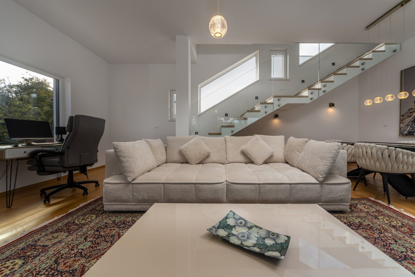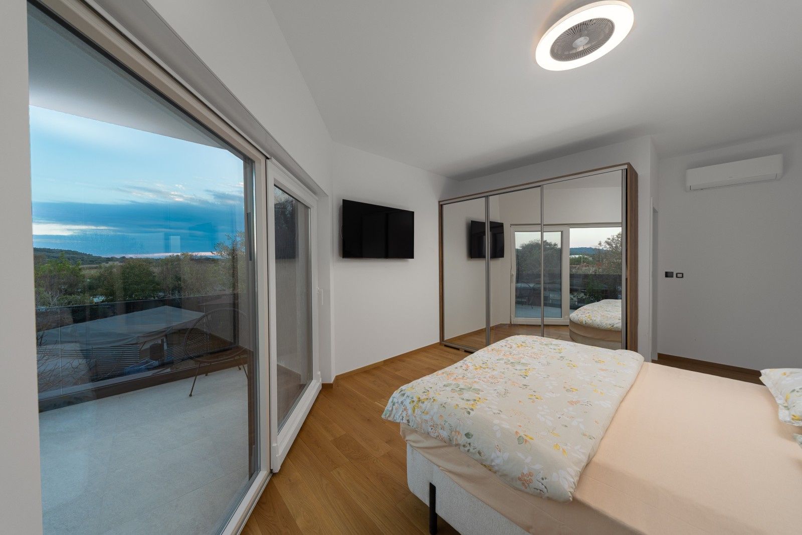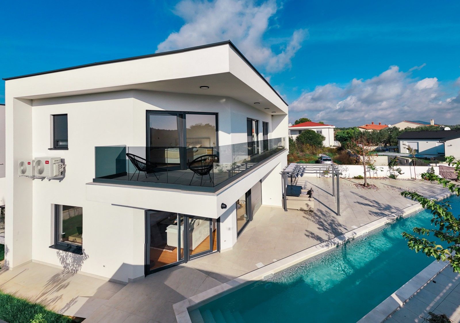 Tato elegantní vila obklopená přírodou nabízí pohodlí a soukromí pro všechny členy rodiny. Rozkládá se na dvou podlažích – přízemí a prvním patře – a představuje dokonalou rovnováhu mezi moderním komfortem a středomořským šarmem. Vila s velkou upravenou zahradou se v přízemí skládá z technické místnosti, šatny, prostorného obývacího pokoje s jídelním koutem a samostatné kuchyně. Velké prosklené stěny se otevírají na venkovní terasu a k impozantnímu vyhřívanému bazénu o rozměrech 3 x 23 m. Vnitřní schodiště vede do prvního patra, kde se nacházejí tři prostorné ložnice (všechny s přístupem na terasu), chodba, dvě koupelny a velká krytá terasa. Pozemek je pečlivě upravený středomořskou vegetací, jako je levandule, rozmarýn, oleandr, ovocné stromy, kiwi a šeřík, a automatický zavlažovací systém zajišťuje jejich dlouhodobou krásu. Venku se nachází jídelní stůl, pergola o rozměrech 4 x 4 m, gril a letní kuchyně, zatímco sedací souprava a místo na opalování s lehátky poskytují další pohodlí, ideální pro plné vychutnání klidného okolí. Bezpečnost je zajištěna alarmovým systémem, videotelefonem a elektronickým zámkem s klávesnicí. Interiér je vybaven dubovými parketami s podlahovým vytápěním, zatímco příjemné klima v každé místnosti zajišťují klimatizační jednotky BOSCH. K dispozici je parkoviště pro tři auta s automatickou bránou do dvora. Vila se nachází ve vynikající lokalitě, v klidném prostředí, ale přesto v blízkosti moře a pláží.