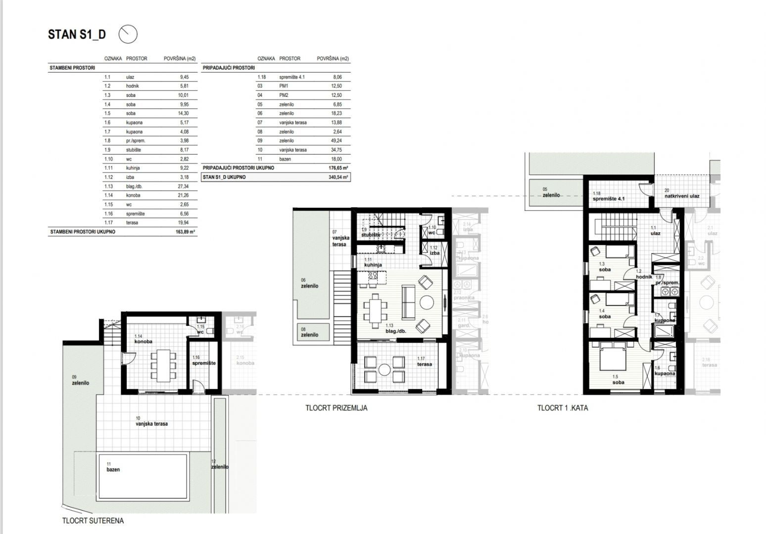RIJEKA, KOSTRENA - exkluzivní dvoupodlažní byt 163,89 m2, novostavba s krásným výhledem na moře a bazén + zahrada 176,65 m2 - S1-D Nabízíme nemovitost, která Vám nabízí moderní design a eleganci, komfort a špičkové vybavení a nachází se v krásné, klidné lokalitě v blízkosti MHD, škol, školek, nákupních center a deset minut jízdy od Rijeky. Komplex 4 bytových domů s celkem 8 apartmány se nachází severně od Jadranské magistrály v oblasti "Zelena Kostrena" odkud je krásný výhled na celý Kvarnerský záliv. V bezprostřední blízkosti se nachází 10 kilometrů dobře udržovaných turistických, cyklistických a fitness stezek, které procházejí nejvyššími částmi Kostrena od vrcholu Solin až po vrchol Sopalj. Přístup k domům je řešen z horní komunikace, kde je plánována úprava a rozšíření stávající komunikace. Každý dům má čtyři venkovní parkovací stání, nebo dvě parkovací stání na bytovou jednotku. Každý dům se skládá ze dvou apartmánů. Byty na horních dvou pozemcích jsou umístěny nad sebou, byty na spodních dvou pozemcích jsou umístěny vedle sebe. Ke každému bytu náleží část zahrady. DŮM D byt S1 - D: OBYTNÉ PROSTORY: - vchod 9,45 - chodba 5,81 - pokoj 10,01 - pokoj 9,95 - pokoj 14,30 - koupelna 5,17 - koupelna 4,08 - prádelna / komora 3,98 - schodiště 8,17 - wc 2,82 - pokoj kuch. 2,22 - zav. hostinec 21,26 - wc 2,65 - komora 6,56 - terasa 19,94 CELKEM BYTNÝCH PROSTOR: 163,89 m² SPOLEČENSKÉ PROSTORY: - komora 4,1 8,06 - stání 1 12,50 - zeleň stání 2 12,38,50 - zeleň venkovní terasa 12,89,50 - zeleň - zeleň 2,64 - zeleň 49,24 - venkovní terasa 34,75 - bazén 18,00 VYŘIZOVANÉ PROSTORY CELKEM: 176,65 m² BYT S1-D CELKEM: 340,54 m² Tento luxusní byt je navržen pro maximální pohodlí. VYBAVENÍ: Dům, ve kterém se byt nachází, je kvalitně postavený a luxusně vybavený, veškeré vestavěné materiály, podlahové a stěnové krytiny jsou na nejvyšší úrovni. - zateplení fasády o tloušťce 10 cm - podlahové vytápění - tepelná čerpadla - špičkové hliníkové truhlářství. K bytu náleží vlastní zahrada a 2 parkovací stání. CENA: Uvedená cena se vztahuje na kompletně dokončené zařízení na klíč, bez nábytku. Cena je včetně DPH, kupující je osvobozen od placení daně z nemovitých věcí. V případě nákupu od společnosti registrované v Chorvatsku je po prodeji možné vrácení DPH v plné výši. Čistý a uklizený majetek. Určitě krásná nemovitost pro luxusní rodinný život, ale vhodná i jako investice v podobě elitní turistiky. JEDINEČNÁ NEMOVITOST ROZHODNĚ STOJÍ ZA VAŠI POZORNOST VE SKVĚLÉ MÍSTĚ!!! KOSTRÉNA Kostrena je staré oblíbené přímořské město, poprvé zmíněno na začátku 15. století. První obecní samostatnost získala v roce 1874, ale udržela si ji velmi krátce, pouhé dva roky. Je rozdělena na dvě části, sv. Lucii a sv. Barbory, podle názvů dvou kostelů, které v jeho areálu existují. Kostrena se nachází v bezprostřední blízkosti města Rijeka, obklopeného zálivy Martinšćica a Bakar. Poloostrov Kostrena je asi 10 kilometrů dlouhý a mírně se svažuje k pobřeží. Po celé její délce jsou krásné pláže, které v létě navštěvují tisíce plavců. Nejznámější a nejnavštěvovanější jsou ty v zátoce Žurkovo, dále Smokvinovo, Svežanj, Spužvina, Podražica, Nova voda a Perilo. Kostrena se skládá z asi dvaceti osad, z nichž mnohé byly pojmenovány po rodinách, a dnes jsou nejlidnatější Vrh Martinšćice, Glavani, Sv. Lucija, Rožmanići, Doričići a Paveki. Charakteristickým znakem této oblasti je charakteristická krasová oblast se středomořskými rostlinami a slavnou Kostrena gromača, stejně jako mírné klima, které někdy ustupuje silným poryvům větru bóra.