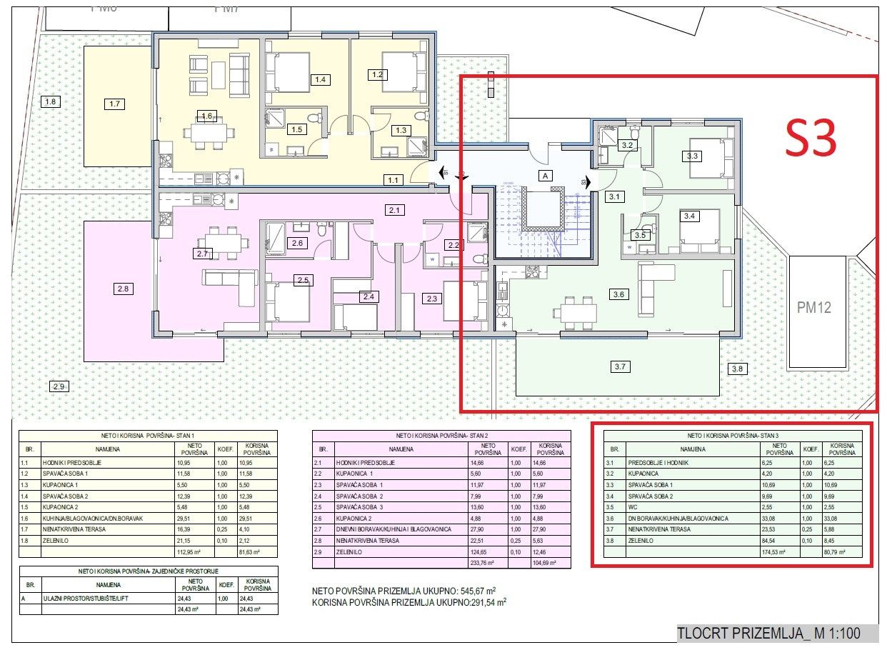 ŠIBENIK, SRIMA – Exkluzivní byt v přízemí, 70 m od moře a pláže – rarita na trhu X představuje moderní byt S3, který se nachází v novostavbě s celkem osmi bytovými jednotkami, na mimořádně atraktivním místě v Srimě, pouhých 70 metrů od moře a pláže, ve druhé řadě od moře. Tato unikátní nemovitost dokonale kombinuje špičkovou kvalitu konstrukce, moderní design a vynikající polohu, což z ní činí ideální volbu pro klidný rodinný život, dovolenou nebo investici v blízkosti moře. Byt se nachází v přízemí budovy, což umožňuje snadný přístup na terasu a prostornou zahradu, a díky své jihovýchodní orientaci se těší dostatku přirozeného světla po celý den. Celková čistá plocha bytu je 174,53 m², zatímco užitná obytná plocha je 80,79 m². Zvláštní hodnotu této nemovitosti dodává prostorný dvůr o rozloze 84,54 m², což je na trhu skutečná rarita a ideální místo k relaxaci a vychutnání si středomořské atmosféry. Popis prostoru: Byt S3 má mimořádně funkční dispozici a vzdušné místnosti. Po vstupu vás přivítá chodba s předsíní, která vede do otevřeného prostoru obývacího pokoje, kuchyně a jídelny s přístupem na velkou nekrytou terasu a upravenou zahradu, ideální pro venkovní bydlení. K dispozici jsou také dvě ložnice, koupelna a samostatná toaleta, která poskytuje dodatečnou praktičnost. K bytu náleží také jedno parkovací místo, což dále zvyšuje jeho funkčnost a hodnotu. Půdorys (čistá plocha): Vstupní hala a chodba: 6,25 m² Koupelna: 4,20 m² Ložnice 1: 10,69 m² Ložnice 2: 9,69 m² WC: 2,55 m² Obývací pokoj, kuchyň a jídelna: 33,08 m² Nekrytá terasa: 23,53 m² Zahrada: 84,54 m² Celková čistá plocha: 174,53 m² Užitná obytná plocha: 80,79 m² Vybavení a prvky: Vzdálenost od moře a pláže: 70 m / 1 minuta chůze Orientace: jihovýchod Podlahové vytápění v koupelně a obývacím pokoji Klimatizace ve všech místnostech PVC okna s trojsklem a elektrickými roletami Tepelně izolovaná fasáda (10 cm) Keramika a sanitární keramika nejvyšší kvality od renomovaných výrobců Vysoce kvalitní materiály a provedení Seriózní dodavatel s osvědčenou pověstí Jedno parkovací místo v ceně Prostorná zahrada o rozloze 84,54 m² - rarita na trhu Tato moderní novostavba v Srimě představuje vynikající příležitost k nákupu luxusního apartmánu v blízkosti moře, který kombinuje pohodlí, funkčnost a prestižní lokalitu. Pro veškeré další informace a pro domluvení prohlídky nás prosím kontaktujte. Srima je klidná a okouzlující přímořská vesnice známá svými dlouhými oblázkovými plážemi, křišťálově čistým mořem a uvolněnou středomořskou atmosférou. Díky své blízkosti Vodice a Šibeniku nabízí perfektní rovnováhu mezi klidem a dostupností veškerého vybavení potřebného pro pohodlný život.