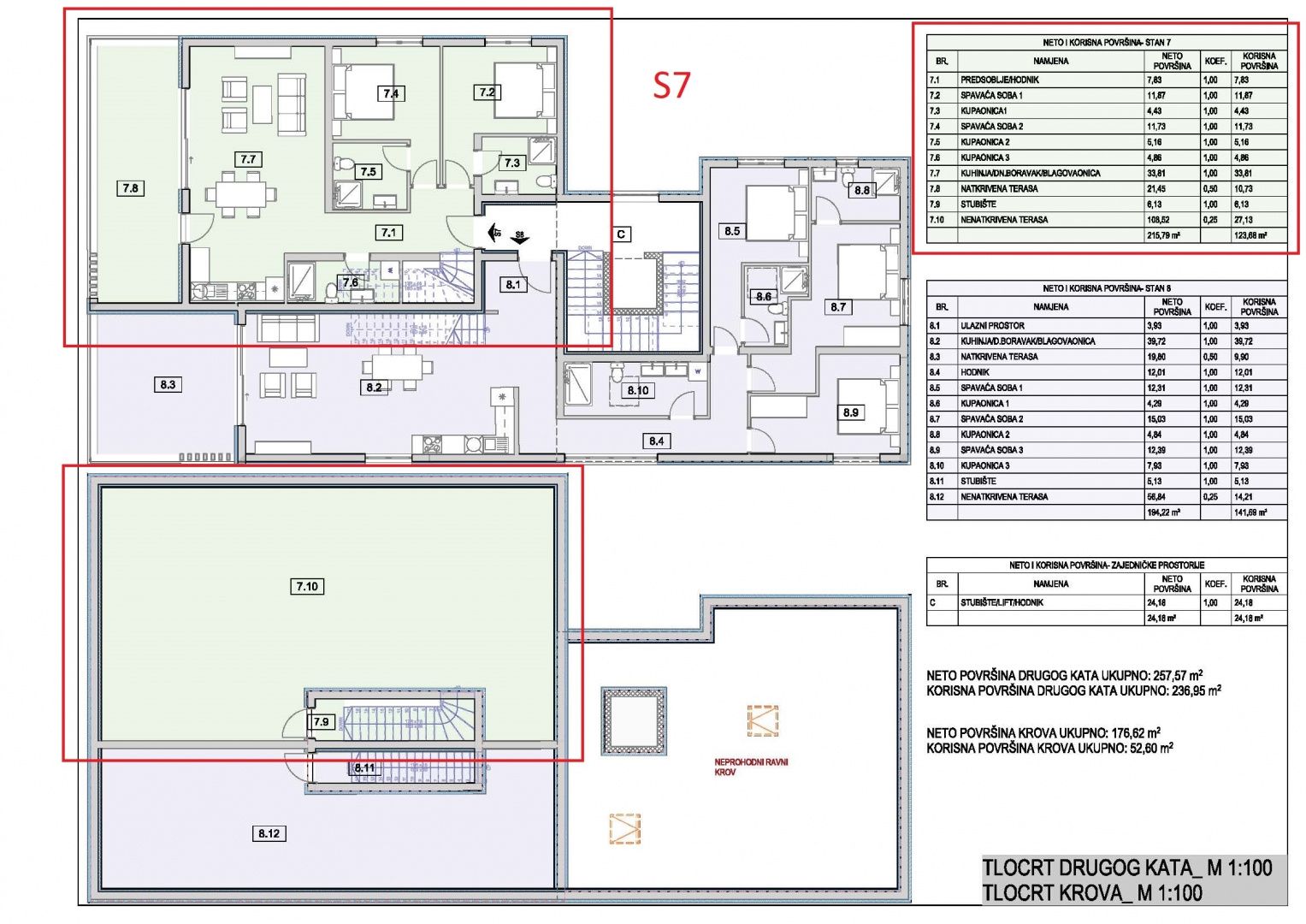 ŠIBENIK, SRIMA – Luxusní penthouse se střešní terasou, výhledem na moře a výtahem, 70 m od pláže DUX Nekretnine představuje exkluzivní penthouse S7, který se nachází ve druhém patře moderní novostavby s celkem osmi bytovými jednotkami, v mimořádně atraktivní lokalitě v Srimě, pouhých 70 metrů od moře a pláže, ve druhé řadě od moře. Tato unikátní nemovitost kombinuje špičkovou kvalitu konstrukce, moderní design a prestižní polohu – ideální volbu pro luxusní rodinný život, dovolenou nebo investici s výjimečným potenciálem pronájmu. Penthouse S7 nabízí prostorné a funkční uspořádání se dvěma ložnicemi, každá s vlastní koupelnou, další třetí koupelnou a prostorným obývacím pokojem s otevřeným konceptem, který kombinuje kuchyň, jídelnu a obývací pokoj. Obývací pokoj se otevírá na krytou terasu o rozloze 21,45 m², ideální pro relaxaci a užívání si středomořské atmosféry. Zvláštností této nemovitosti je impozantní střešní terasa o rozloze 108,52 m², která nabízí panoramatický výhled na moře - ideální místo pro soukromé opalování, vířivku, letní kuchyň nebo venkovní posezení. Apartmán je orientován směrem k moři, což zajišťuje dostatek přirozeného světla a nádherný výhled po celý den. Budova má výtah a k apartmánu náleží i jedno parkovací místo. Celková čistá plocha apartmánu je 215,79 m², zatímco užitná obytná plocha je 123,68 m². Půdorys (čistá plocha): Vstupní hala / chodba: 7,83 m² Ložnice 1: 11,87 m² Koupelna 1 (s vlastní koupelnou): 4,43 m² Ložnice 2: 11,73 m² Koupelna 2 (s vlastní koupelnou): 5,16 m² Koupelna 3: 4,86 m² Kuchyň, obývací pokoj a jídelna: 33,81 m² Krytá terasa: 21,45 m² Schodiště: 6,13 m² Střešní terasa: 108,52 m² Celková čistá plocha: 215,79 m² Užitná obytná plocha: 123,68 m² Vybavení a funkce: Vzdálenost od moře a pláže: 70 m / 1 minuta chůze Druhé patro s panoramatickým výhledem na moře Výtah v budově Dvě ložnice, každá s vlastní koupelnou (en-suite) Celkem tři koupelny Prostorná střešní terasa 108,52 m² Krytá terasa s výhledem na moře Otevřený obytný prostor: kuchyň, jídelna a obývací pokoj Jedno parkovací místo v ceně Venkovní truhlářské práce z vysoce kvalitních hliníkových profilů se šesti komorami a trojitým sklem s vynikající energetickou účinností - vnější strana profilu v bronzové barvě, vnitřní strana v bílé - elektricky ovládané rolety a sítě proti hmyzu - zdvižně-posuvné stěny, kování a kliky od renomovaných výrobců Bezpečnostní a protipožární vstupní dveře od renomovaného výrobce s certifikátem Vnitřní dveře se skrytými panty a magnetickými zámky - zárubně a lišty z masivního dřeva Skleněné terasové zábradlí typu Lamistal 2x1 cm Stěny a stropy omítnuté a natřené bílou barvou Vnitřní kamenné parapety Plano, tloušťka 3 cm, leštěné a s profilovanými hranami V interiéru a na terasách jsou podlahové krytiny a dlažba extra třídy Koupelny obložené keramickými dlaždicemi až ke stropu Podlahové vytápění v celém bytě Klimatizace v obývacím pokoji (5,0 kW invertor) a v ložnicích (2,5 kW invertor na místnost) Sanitární vybavení od renomovaných výrobců (Kolpa-san, Hansgrohe) Vestavěné splachovací nádržky (Liv, Geberit), skleněné sprchové stěny a žlaby (Voxort nebo podobné) Modulární vypínače a zásuvky od výrobce TEM v bílé barvě Osvětlení v koupelnách a na terasách stropní světla, v ostatních prostorách zásuvky se žárovkou Pozemní a satelitní anténa s přípojkami v obývacím pokoji a ložnicích Renomovaný dodavatel s osvědčenou pověstí Tato moderní novostavba v Srimě nabízí dokonalou rovnováhu mezi luxusem, pohodlím a funkčností v bezprostřední blízkosti moře a pláže. Vynikající příležitost pro ty, kteří hledají exkluzivní penthouse s panoramatickým výhledem na moře a prostornou střešní terasou v klidném, ale velmi žádaném prostředí. Srima je klidná a okouzlující přímořská vesnice známá svými dlouhými oblázkovými plážemi, křišťálově čistým mořem a uvolněnou středomořskou atmosférou. Díky blízkosti Vodice a Šibeniku nabízí perfektní rovnováhu mezi klidem a dostupností veškerého vybavení potřebného pro pohodlný život. Pro veškeré další informace a prohlídky nás prosím kontaktujte.