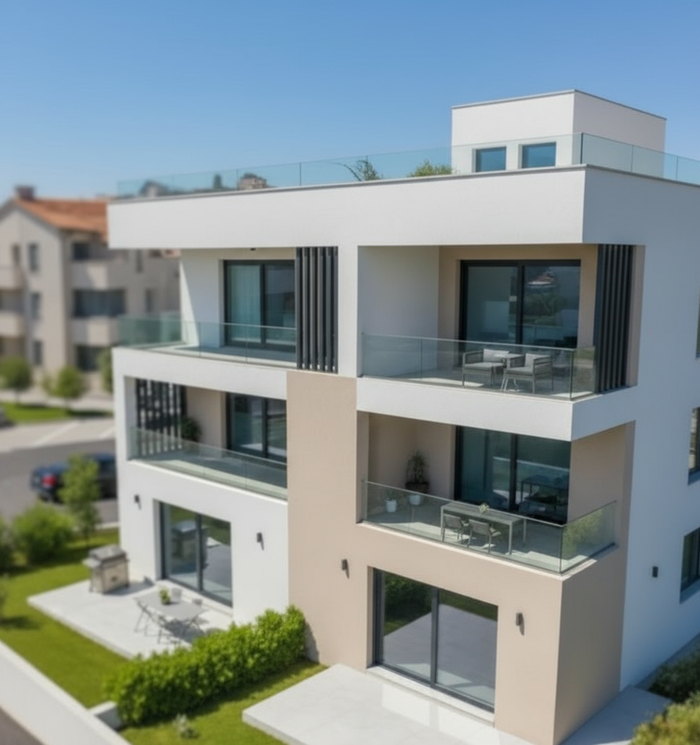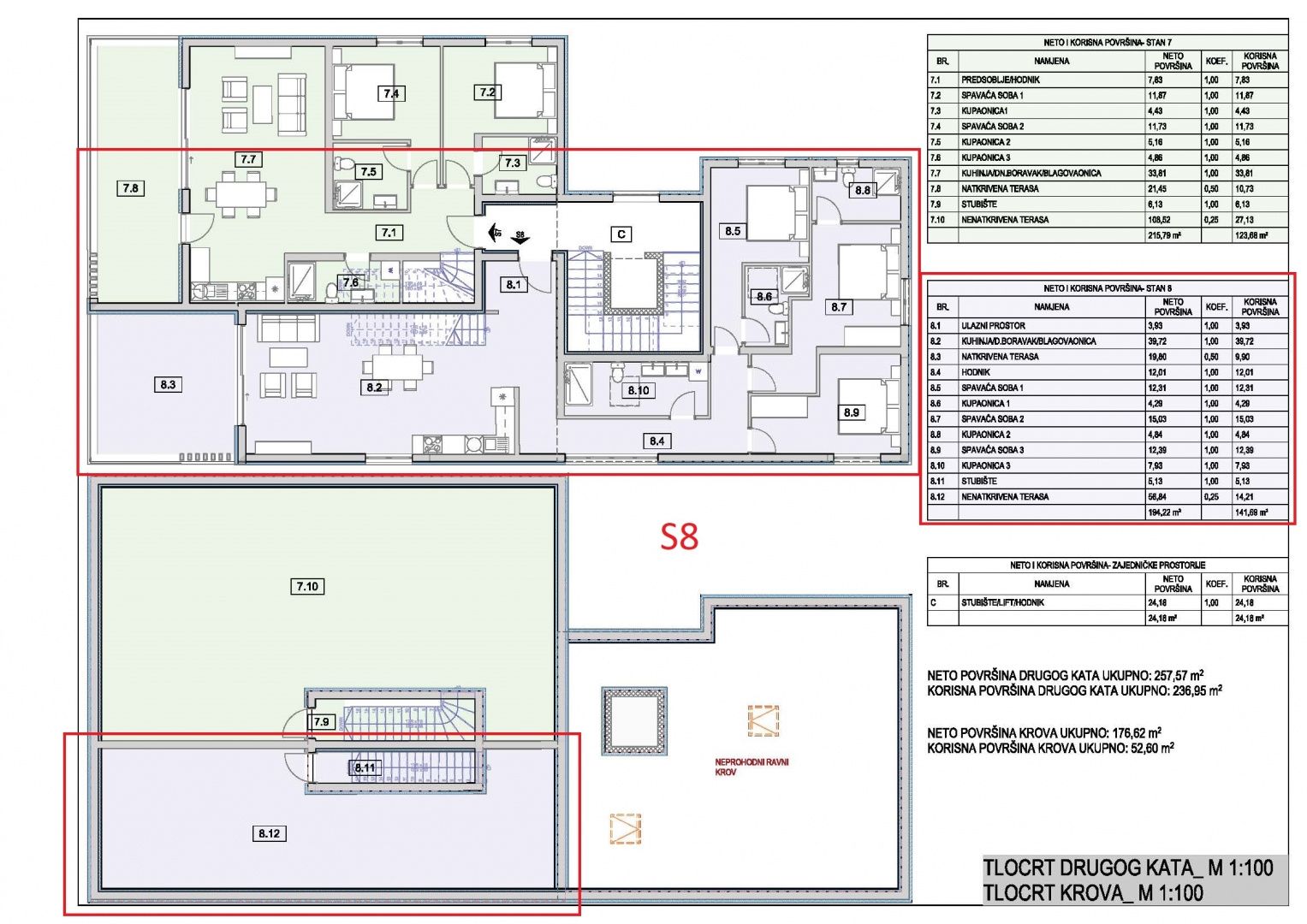ŠIBENIK, SRIMA – Luxusní penthouse v novostavbě se střešní terasou, výhledem na moře a výtahem DUX Nekretnine představuje exkluzivní penthouse S8, který se nachází ve druhém patře moderní novostavby s celkem osmi bytovými jednotkami, v mimořádně atraktivní lokalitě v Srimě, pouhých 70 metrů od moře a pláže, ve druhé řadě od moře. Tato unikátní nemovitost kombinuje špičkovou kvalitu konstrukce, moderní design a prestižní polohu – ideální volbu pro luxusní rodinný život, dovolenou nebo investici s výjimečným potenciálem k pronájmu. Penthouse S8 nabízí prostorné a funkční uspořádání se třemi ložnicemi, z nichž dvě mají vlastní koupelnu, celkem třemi koupelnami a prostorným obývacím pokojem s otevřeným konceptem, který kombinuje kuchyň, jídelnu a obývací pokoj. Obývací pokoj se otevírá na krytou terasu o rozloze 19,80 m², ideální pro relaxaci a užívání si středomořské atmosféry. Zvláštností této nemovitosti je prostorná střešní terasa o rozloze 56,84 m² s výhledem na moře - ideální místo pro soukromé opalování, vířivku, letní kuchyň nebo venkovní posezení. Apartmán je orientován směrem k moři, což zajišťuje dostatek přirozeného světla a nádherný výhled po celý den. Budova má výtah a k apartmánu náleží i jedno parkovací místo. Celková čistá plocha apartmánu je 194,22 m², zatímco užitná obytná plocha je 141,69 m². Půdorys (čistá plocha): • Vstupní prostor: 3,93 m² • Kuchyň, obývací pokoj a jídelna: 39,72 m² • Krytá terasa: 19,80 m² • Chodba: 12,01 m² • Ložnice 1: 12,31 m² • Koupelna 1: 4,29 m² • Ložnice 2: 15,03 m² • Koupelna 2: 4,84 m² • Ložnice 3: 12,39 m² • Koupelna 3: 7,93 m² • Schodiště: 5,13 m² • Střešní terasa: 56,84 m² Celková čistá plocha: 194,22 m² Užitná obytná plocha: 141,69 m² Vybavení a vlastnosti: • Vzdálenost od moře a pláže: 70 m / 1 minuta chůze • Druhé patro s výhledem na moře • Výtah v budově • Tři ložnice, dvě s vlastní koupelnou (en-suite) • Celkem tři koupelny • Prostorná střešní terasa 56,84 m² • Krytá terasa s výhledem na moře • Otevřený obytný prostor: kuchyň, jídelna a obývací pokoj • Jedno parkovací místo v ceně • Venkovní truhlářské práce z vysoce kvalitních hliníkových profilů se šesti komorami a trojitým sklem s vynikající energetickou účinností - vnější strana profilu v bronzové barvě, vnitřní strana v bílé - elektricky ovládané rolety a sítě proti hmyzu - zdvižně-posuvné stěny, kování a kliky od renomovaných výrobců • Vstupní dveře odolné proti vloupání a požáru od renomovaného výrobce s certifikátem • Vnitřní dveře se skrytými panty a magnetickými zámky - zárubně a lišty z masivního dřeva • Skleněné terasové zábradlí typu Lamistal 2x1 cm • Stěny a stropy omítnuté a natřené bílou barvou • Vnitřní parapety z kamene Plano o tloušťce 3 cm, leštěné a s profilovanými hranami • Extra třída Podlahové krytiny a dlažba ve vnitřních prostorách a na terasách • Koupelny obložené keramickými dlaždicemi až ke stropu • Podlahové vytápění v celém bytě • Klimatizace v obývacím pokoji (5,0 kW invertor) a v ložnicích (2,5 kW invertor na místnost) • Sanitární vybavení od renomovaných výrobců (Kolpa-san, Hansgrohe) • Vestavěné splachovací nádržky (Liv, Geberit), skleněné sprchové stěny a kanály (Voxort nebo podobné) • Modulární vypínače a zásuvky od výrobce TEM v bílé barvě • Svítidla v koupelnách a na terasách jsou stropní světla, v ostatních prostorách objímka se žárovkou • Pozemní a satelitní anténa s přípojkami v obývacím pokoji a ložnicích • Renomovaný dodavatel s prokázanou pověstí Tato moderní novostavba v Srimě nabízí dokonalou rovnováhu mezi luxusem, komfortem a funkčností v lokalitě blízko moře a pláže. Vynikající příležitost pro ty, kteří hledají exkluzivní penthouse s výhledem na moře a prostornou střešní terasou v klidném, ale přesto mimořádně žádaném prostředí. Srima je klidné a okouzlující přímořské letovisko známé svými dlouhými oblázkovými plážemi, křišťálově čistým mořem a uvolněnou středomořskou atmosférou. Díky své blízkosti Vodice a Šibeniku nabízí perfektní rovnováhu mezi klidem a dostupností veškerého vybavení potřebného pro pohodlný život. Pro veškeré další informace a prohlídky nás prosím kontaktujte.