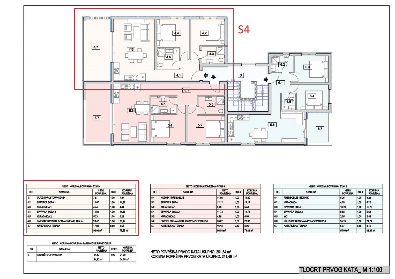 ŠIBENIK, SRIMA – Moderní byt v novostavbě s výhledem na moře, 70 m od pláže, výtah představujeme elegantní byt S4, který se nachází v prvním patře moderní novostavby s celkem osmi bytovými jednotkami, v mimořádně atraktivní lokalitě v Srimě, pouhých 70 metrů od moře a pláže, ve druhé řadě od moře. Tato nemovitost kombinuje špičkovou kvalitu konstrukce, moderní design a prestižní polohu – ideální volba pro klidný rodinný život, dovolenou nebo investici s vynikajícím potenciálem k pronájmu. Byt S4 nabízí funkční a moderní dispozici se dvěma ložnicemi a dvěma koupelnami, z nichž jedna patří k hlavní ložnici a zajišťuje větší soukromí a pohodlí. Prostorný obývací pokoj s otevřeným konceptem zahrnuje obývací pokoj, jídelnu a kuchyň a umožňuje příjemný a světlý pobyt. Z obývacího pokoje a jídelny je přístup na krytou terasu o rozloze 17,02 m² s krásným výhledem na moře, ideální pro relaxaci a užívání si středomořské atmosféry. Celková čistá plocha bytu je 86,06 m², zatímco užitná obytná plocha je 77,55 m². Byt je orientován na západ, což zajišťuje dostatek přirozeného světla a příjemnou atmosféru během dne. Budova má výtah a k bytu náleží i jedno parkovací místo. Nachází se v bezprostřední blízkosti moře a pláže, pouhých 70 metrů, což z této nemovitosti činí mimořádně atraktivní příležitost k bydlení nebo investici. Půdorys (čistá plocha): • Vstupní prostor / chodba: 7,67 m² • Ložnice 1 (hlavní ložnice s vlastní koupelnou): 11,67 m² • Koupelna 1 (s vlastní koupelnou): 4,44 m² • Ložnice 2: 11,56 m² • Koupelna 2: 5,23 m² • Obývací pokoj, jídelna a kuchyň: 28,47 m² • Krytá terasa: 17,02 m² Celková čistá plocha: 86,06 m² Užitná obytná plocha: 77,55 m² Vybavení a prvky: • Vzdálenost od moře a pláže: 70 m / 1 minuta chůze • První patro s výhledem na moře • Výtah v budově • Dvoupokojový apartmán se dvěma koupelnami • Hlavní ložnice s vlastní koupelnou • Krytá terasa s výhledem na moře • Venkovní truhlářské práce z vysoce kvalitních hliníkových profilů se šesti komorami a trojitým sklem s vynikající energetickou účinností – vnější strana profilu v bronzové barvě, vnitřní strana v bílé – elektricky ovládané rolety a sítě proti hmyzu – zdvižně-posuvné stěny, kování a kliky od renomovaných výrobců • Vstupní dveře odolné proti vloupání a požáru od renomovaného výrobce s certifikátem • Vnitřní dveře se skrytými panty a magnetickými zámky – zárubně a lišty z masivního dřeva • Skleněné terasové zábradlí, typ Lamistal 2x1 cm • Stěny a stropy omítnuté a natřené bílou barvou • Vnitřní parapety z kamene Plano o tloušťce 3 cm, leštěné a s profilovanými hranami • Vysoce kvalitní podlahové krytiny a dlažba ve vnitřních prostorách a na terasách • Koupelny obložené keramickou dlažbou až ke stropu • Podlahové vytápění v celém bytě • Klimatizace v obývacím pokoji (invertor 5,0 kW) a v ložnicích (invertor 2,5 kW na místnost) • Sanitární vybavení od renomovaných výrobců (Kolpa-san, Hansgrohe), vestavěné nádržky (Liv, Geberit), skleněné sprchové stěny a žlaby (Voxort nebo podobné) • Modulární vypínače a zásuvky od TEM v bílé barvě • Svítidla v koupelnách a na terasách jsou stropní, v ostatních prostorách jsou zásuvky se žárovkou • Pozemní a satelitní anténa s přípojkami v obývacím pokoji a ložnicích • Renomovaný dodavatel s osvědčenou pověstí • Jedno parkovací místo v ceně Tato moderní novostavba v Srimě nabízí perfektní rovnováhu mezi komfortem, funkčností a luxusem v lokalitě v těsné blízkosti moře a pláže. Vynikající příležitost pro ty, kteří hledají kvalitní byt s výhledem na moře v klidném, ale mimořádně žádaném prostředí. Srima je klidná a okouzlující přímořská vesnice známá svými dlouhými oblázkovými plážemi, křišťálově čistým mořem a uvolněnou středomořskou atmosférou. Díky své blízkosti Vodice a Šibeniku nabízí perfektní rovnováhu mezi klidem a dostupností veškerého vybavení potřebného pro pohodlný život. Pro veškeré další informace a prohlídky nás prosím kontaktujte.