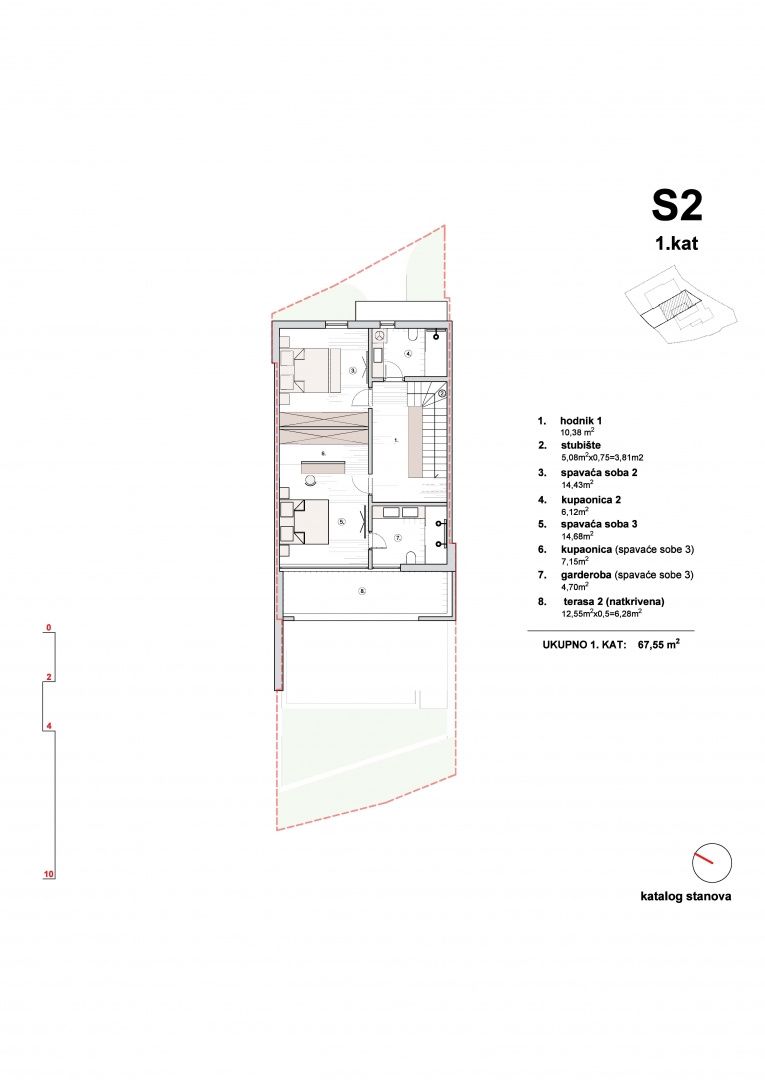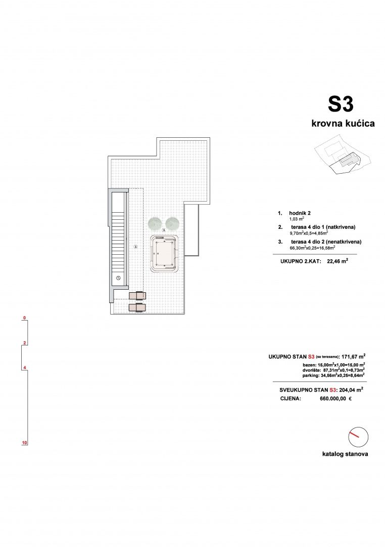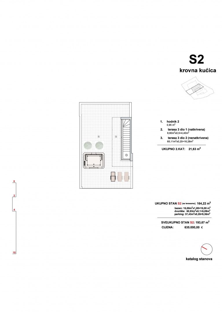 ŠIBENIK, VODICE – Triplex se střešní terasou, bazénem a výhledem shora Prodává se bytová jednotka S2 v luxusním triplexu ve Vodici. Tato nemovitost není určena pro kupující, kteří hledají kompromis mezi cenou a lokalitou. Je určena pro ty, pro které je luxus, výhled na moře, soukromí a kvalita výstavby prioritou. Na luxusní a elitní lokalitě ve Vodici se staví moderní triplex budova se třemi samostatnými bytovými jednotkami, každá se samostatným vchodem, vlastním bazénem a zahradou. Bytové jednotky se rozkládají v přízemí a prvním patře a S2 a S3 mají navíc střešní terasu navrženou pro vířivku a místo k relaxaci s výhledem na moře. Bytová jednotka S2 se rozkládá v přízemí, prvním patře a úrovni střechy a má celkovou užitnou plochu 193,67 m2. V přízemí se nachází ložnice, koupelna a prostorný obývací pokoj s kuchyní a jídelnou v otevřeném konceptu. Velká prosklená stěna propojuje interiér s terasou, bazénem a zahradou, s neustálým vizuálním kontaktem s mořem. V patře se nacházejí dvě ložnice, z nichž hlavní ložnice má vlastní koupelnu a přístup na soukromou terasu, a další koupelna. Kromě přízemí a prvního patra má S2 také střešní terasu, navrženou jako soukromá zóna pro relaxaci, opalování a večerní posezení s panoramatickým výhledem na moře. Plánuje se vířivka a část terasy je zastřešená. Apartmán bude vybaven dle vysokých standardů moderní výstavby s použitím kvalitních materiálů a technických řešení zaměřených na dlouhodobou energetickou účinnost a komfort. Plánuje se moderní hliníkové truhlářské práce, podlahové vytápění pomocí tepelných čerpadel, klimatizace ve všech místnostech, kombinace parket v obytných prostorách a keramických podlah v koupelnách a technických prostorách. Tento standard vybavení zajišťuje vysokou úroveň komfortu bydlení, nízké náklady na údržbu a stabilní hodnotu nemovitosti v průběhu času. S2 je ideální volbou pro kupující, kteří chtějí zážitek luxusní vily, ale ve formátu moderní a racionálně navržené novostavby. VODICE – Okouzlující město nočního života a pláží Vodice je turistická destinace ležící 10 kilometrů severně od Šibeniku. Vodice se pyšní skvělými hotely, plážemi a bohatým nočním životem. Nedaleko se nachází malý ostrov Prvić, město Split je vzdálené 69 km, Zadar 59 km a nejbližší letiště 49 km. Pro další informace nebo pro domluvení prohlídky nás neváhejte kontaktovat.