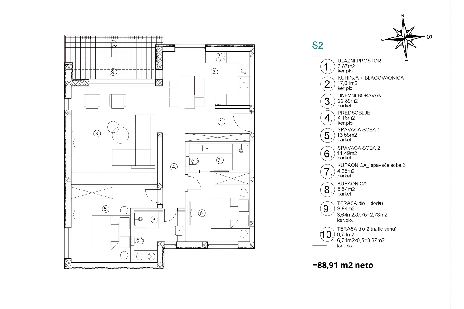 ŠIBENIK, VODICE - Třípokojový apartmán v novostavbě s garáží, skladem a střešní terasou 102 m² s výhledem na moře