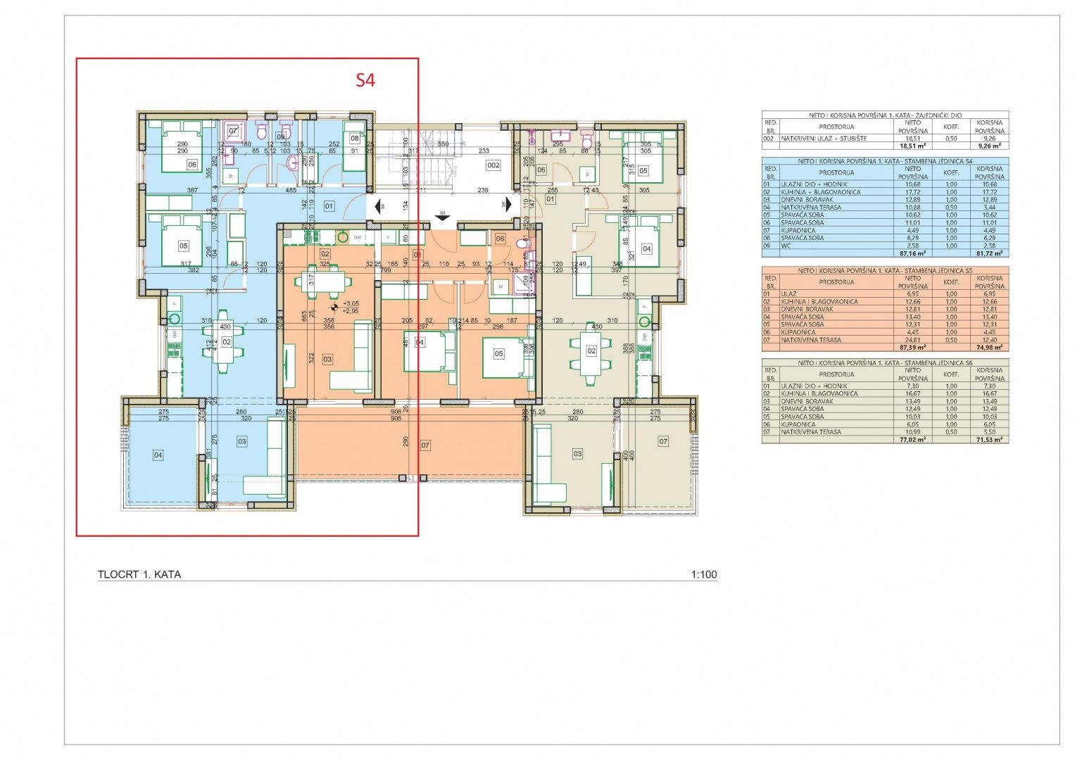 ŠIBENIK, VODICE – Třípokojový apartmán v novostavbě s krásným výhledem na moře! Prodává se třípokojový apartmán v novostavbě s užitnou plochou 88,35 m2 a celkovou plochou 103,79 m2, který se nachází v 1. patře bytového domu s celkem 9 bytovými jednotkami. Apartmán se skládá ze tří ložnic, koupelny a kuchyně s jídelnou a obývacím pokojem, ze které je přístup na krytou terasu. K apartmánu náleží také jedno parkovací místo a úložný prostor v přízemí budovy. Z apartmánu se také nabízí krásný výhled na moře a šibenické souostroví, který vám vyrazí dech! Všechny pokoje v apartmánu a obývacím pokoji jsou klimatizovány. V obývacím pokoji a koupelně bude podlahové vytápění. Všechny otvory budou mít kvalitní truhlářské práce s elektrickými roletami. Ve všech pokojích a obývacím pokoji je k dispozici TV/SAT připojení a v úložném prostoru je nabíječka do auta. Rezidenční budova s 9 bytovými jednotkami se nachází ve Vodicích v krásné mikrolokaci. Mírně vyvýšená poloha budovy poskytuje krásný výhled na moře z apartmánů v 1. a 2. patře a blízkost školy (300 m), nákupních center (500 m), centra Vodic (500 m), pláže (900 m) a veškeré další vybavenosti jen pár minut odtud činí z této nemovitosti ideální volbu pro váš budoucí domov nebo letní sídlo. Pro více informací nebo pro domluvení prohlídky nás prosím kontaktujte! VODICE – Okouzlující město nočního života a pláží Vodice je malá turistická destinace ležící 10 kilometrů severně od Šibeniku. Je oblíbená mezi mladými návštěvníky, kteří hledají živá místa. Vodice se pyšní skvělými hotely, plážemi a bohatým nočním životem. Název „Vodice“ se poprvé zmiňuje v písemných pracích v roce 1402, ačkoli je známo, že zde lidé žili již v římských dobách. Místo bylo pojmenováno „Vodice“ kvůli hojnosti vody a studní. Nedaleko se nachází malý ostrov Prvić, město Split je vzdálené 69 km, Zadar 59 km a nejbližší letiště je vzdálené 49 km.