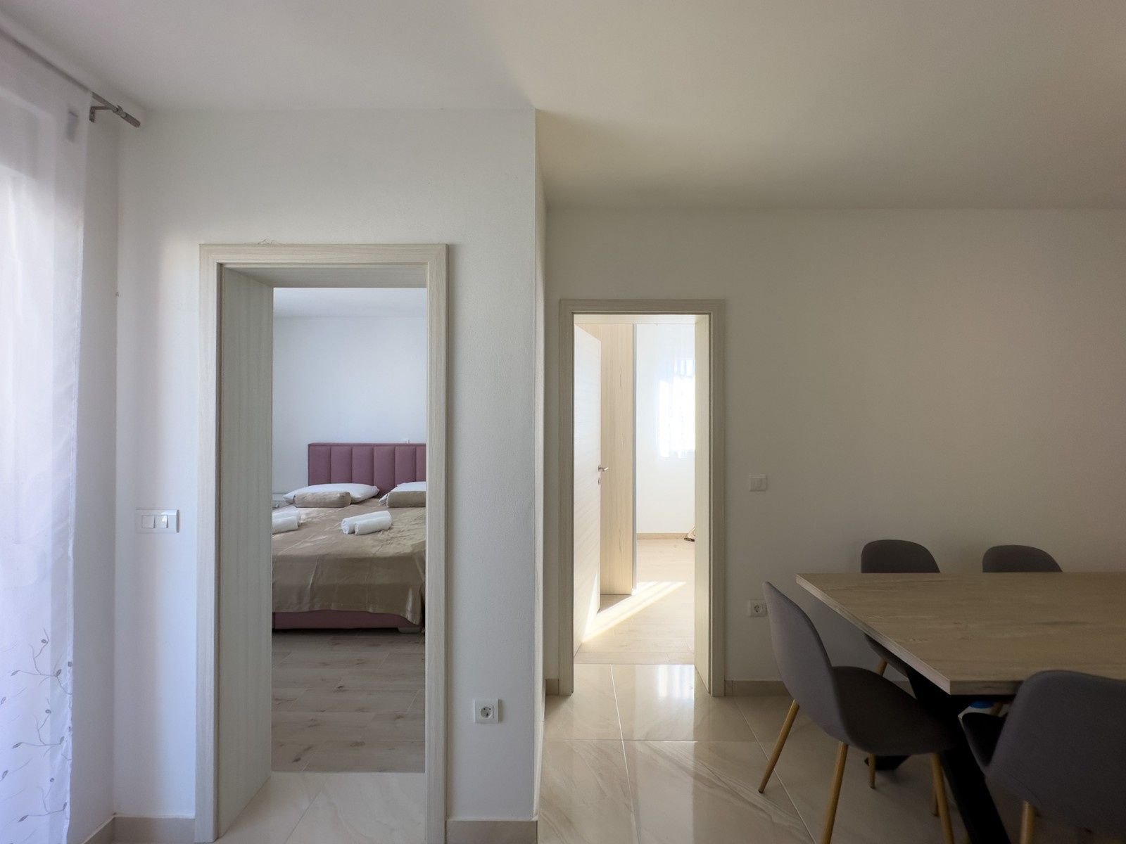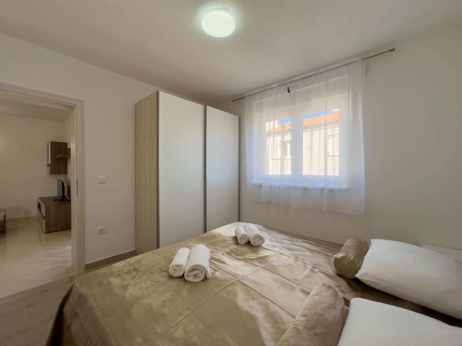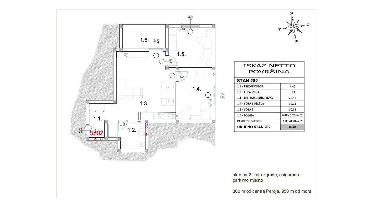 Prodáváme byt (D202) ve druhém patře nové budovy v Peroju! Byt se skládá ze dvou ložnic, koupelny, kuchyně, jídelny a obývacího pokoje, ze kterého se vychází na zastřešenou terasu. Byt má podlahové vytápění ve všech místnostech kromě ložnic, klimatizaci. Byt se prodává bez nábytku s vestavěnými sanitárními zařízeními v koupelně. K bytu náleží parkovací místo PM10, které je zahrnuto v ceně. Pro více informací jsme k dispozici