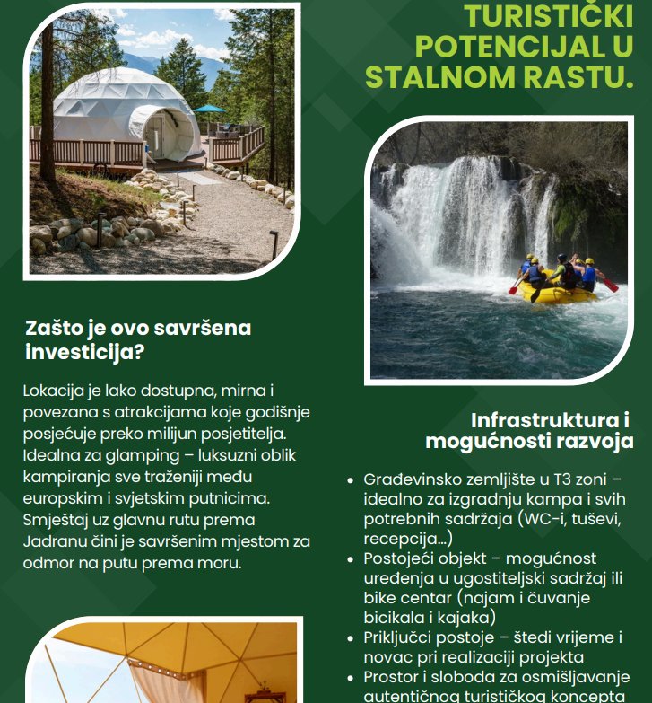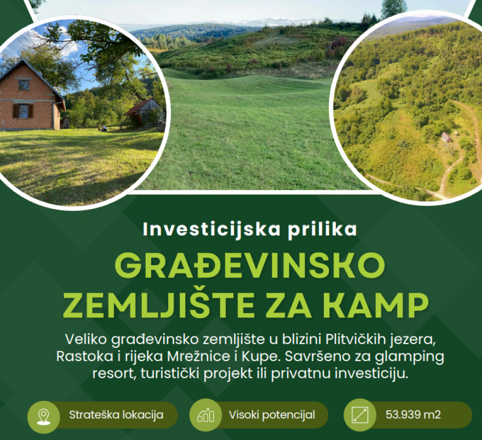 SLUNJ, PRIMIŠLJE - Investiční příležitost - stavební pozemek pro kemp v zóně T3! Na prodej je mimořádně atraktivní stavební pozemek o celkové rozloze 53 939 m², který se nachází v blízkosti Plitvických jezer, Rastoke a řek Mrežnica a Kupa: lokalita s významným turistickým potenciálem a neustálým růstem poptávky. Pozemek se nachází v kempingové zóně T3, což umožňuje výstavbu turistického kempu s podpůrným zázemím, včetně: • stravovacích zařízení • recepce a pomocných budov • sociálního zařízení (WC, sprchy) • glampingových ubytovacích jednotek (chatky, stany, glampingové dómy) • doplňkového vybavení, jako je cyklistické centrum nebo prostor pro outdoorové aktivity Klíčové výhody: ✔ Strategická a snadno dostupná poloha ✔ Klidné, přírodní prostředí ideální pro luxusní glampingový koncept ✔ Stávající zařízení na pozemku - možnost přestavby na stravovací zařízení ✔ Infrastrukturní napojení již existuje (významná úspora času a investic) ✔ Ubytování podél hlavní silnice k Jadranu - perfektní destinace pro "zastávku a odpočinek" Lokalita je obklopena nedotčenou přírodou, kopci a panoramatickými výhledy, což poskytuje perfektní základ pro rozvoj autentického turistického projektu s vysokou přidanou hodnotou. Vzhledem k neustálému růstu poptávky po glampingu a udržitelném cestovním ruchu představuje tato nemovitost výjimečnou příležitost pro investory, kteří chtějí vybudovat moderní kemp nebo butikový turistický resort v jednom z nejslibnějších regionů Chorvatska. Pro více informací a pro sjednání prohlídky nás neváhejte kontaktovat.