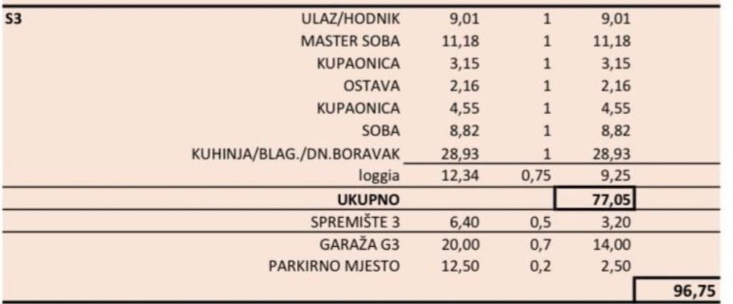 VELIKA GORICA – Moderní novostavba, dvoupokojový byt s lodžií, garáží a parkovacím místem – vynikající investice Nabízíme moderní dvoupokojový byt o celkové rozloze 96,75 m² s příslušenstvím, který se nachází ve 2. patře moderní bytové budovy ve výstavbě, v klidné a velmi vyhledávané městské části Velika Gorica. Budova je vzdálena od hluku z dopravy, což zajišťuje vysokou úroveň soukromí, klidu a kvality bydlení. Nastěhování je plánováno na září 2026. Byt se vyznačuje funkčním a promyšleným uspořádáním a skládá se ze dvou ložnic, dvou koupelen, technické místnosti a prostorného obývacího prostoru s otevřeným konceptem. Zvláštní hodnotu bytu dodává velká lodžie, ideální pro relaxaci a trávení času venku. Kód bytu: S3 – 2. patro DISPOZICE POKOJŮ Vstupní hala – 9,01 m² Kuchyň / jídelna / obývací pokoj – 28,93 m² Hlavní ložnice – 11,18 m² Ložnice – 8,82 m² Koupelna 1 – 3,15 m² Koupelna 2 – 4,55 m² Úložný prostor – 2,16 m² Lodžie – 12,34 m² Čistá užitná plocha bytu: 77,05 m² VYBAVENÍ BYTU Úložný prostor – 6,40 m² Garážové parkovací místo – 20,00 m² Venkovní parkovací místo – 12,50 m² Celková vypočítaná plocha s příslušenstvím: 96,75 m² Budova je postavena s železobetonovou konstrukcí s vysokými standardy odolnými vůči zemětřesení, na plovoucí betonové desce. Vyznačuje se špičkovou tepelnou izolací (15 cm minerální vlny a EPS), PVC truhlářstvím s trojvrstvým zasklením, elektrickými roletami, bezpečnostními dveřmi a videovrátným. Vytápění je zajištěno tepelnými čerpadly s podlahovým vytápěním, ve všech místnostech je instalována klimatizace. Budova má energetický certifikát A+. Nemovitost se nachází v klidné a městské ulici, ideální pro rodinný život. V bezprostřední blízkosti jsou k dispozici školky, školy, obchody, veřejná doprava a veškerá důležitá zařízení, přičemž lokalita poskytuje klid a soukromí. Díky rostoucí poptávce po kvalitních novostavbách ve Veliki Gorici představuje tato nemovitost také bezpečnou dlouhodobou investici s vynikajícím potenciálem pro pronájem nebo další růst hodnoty.