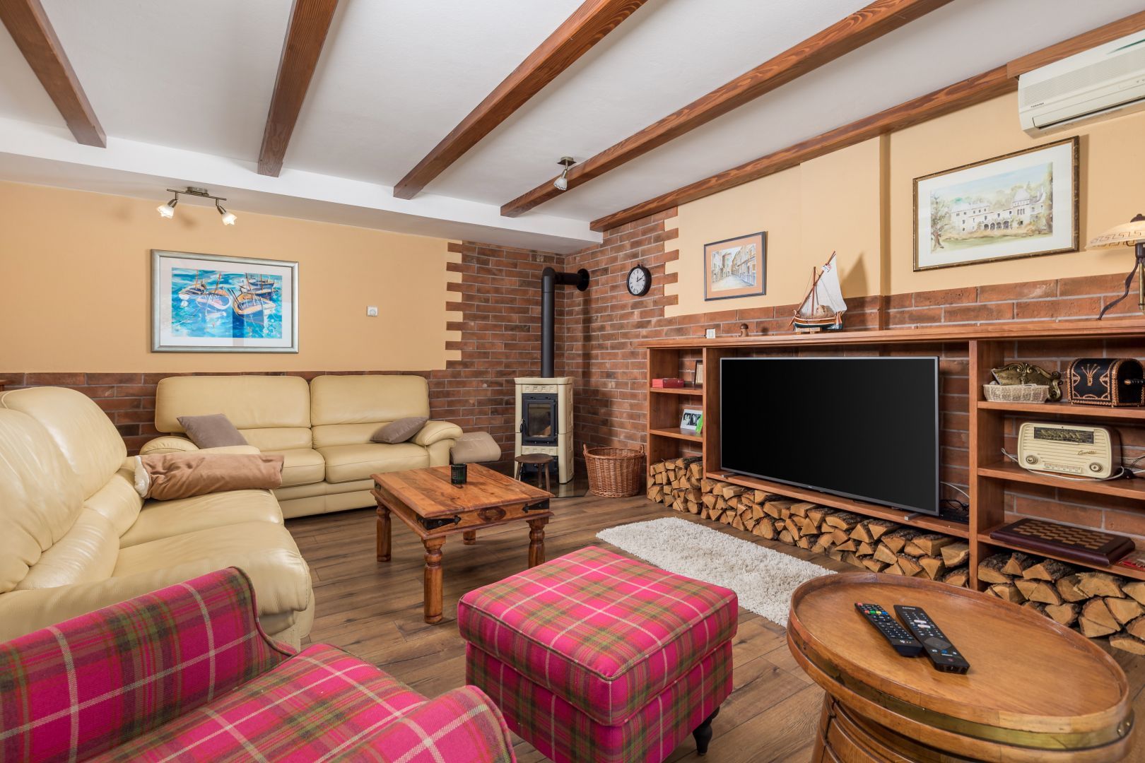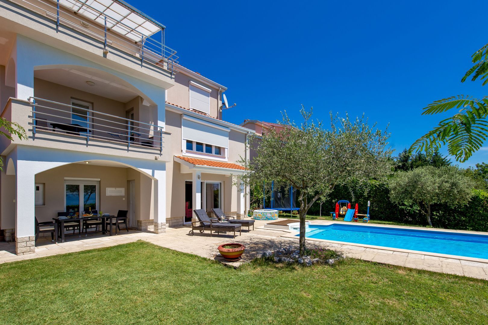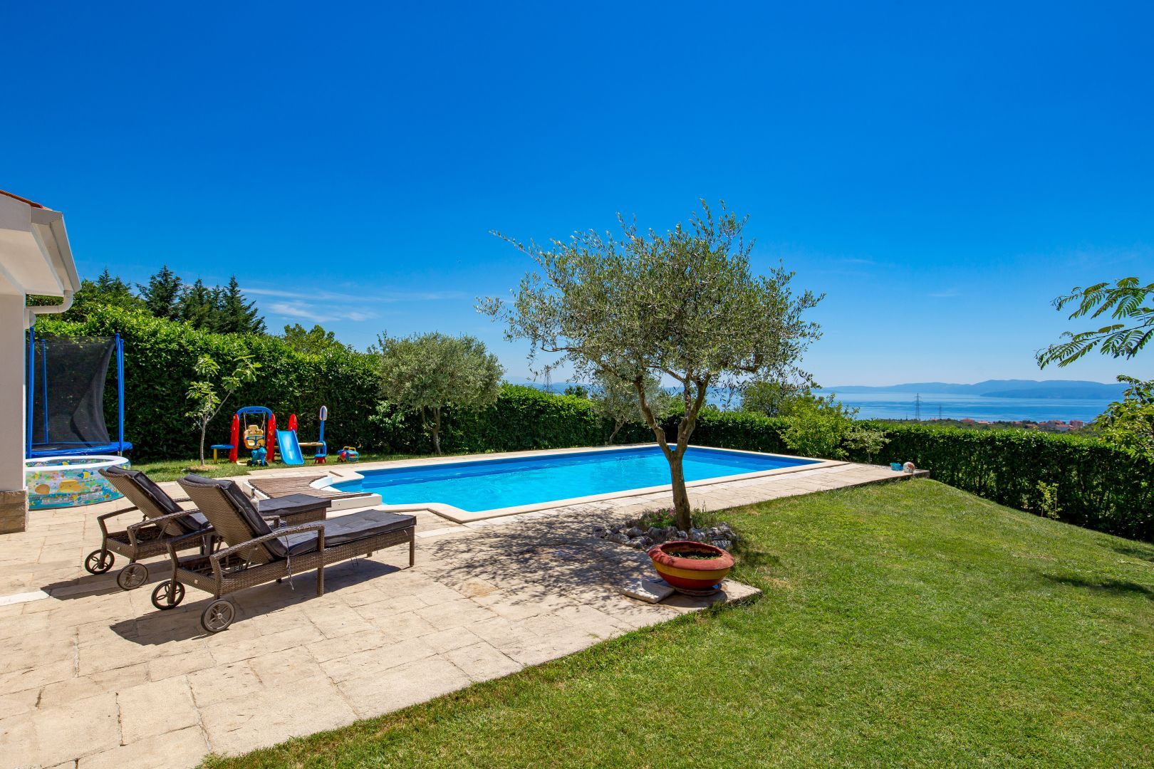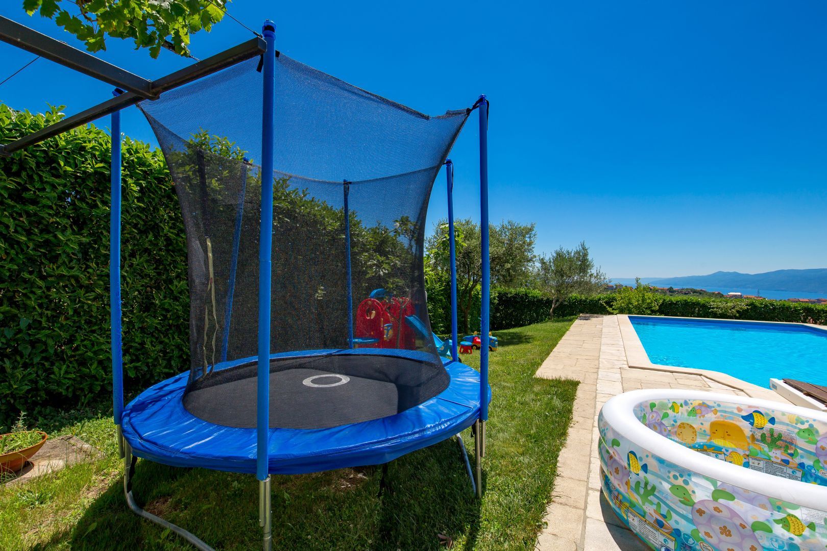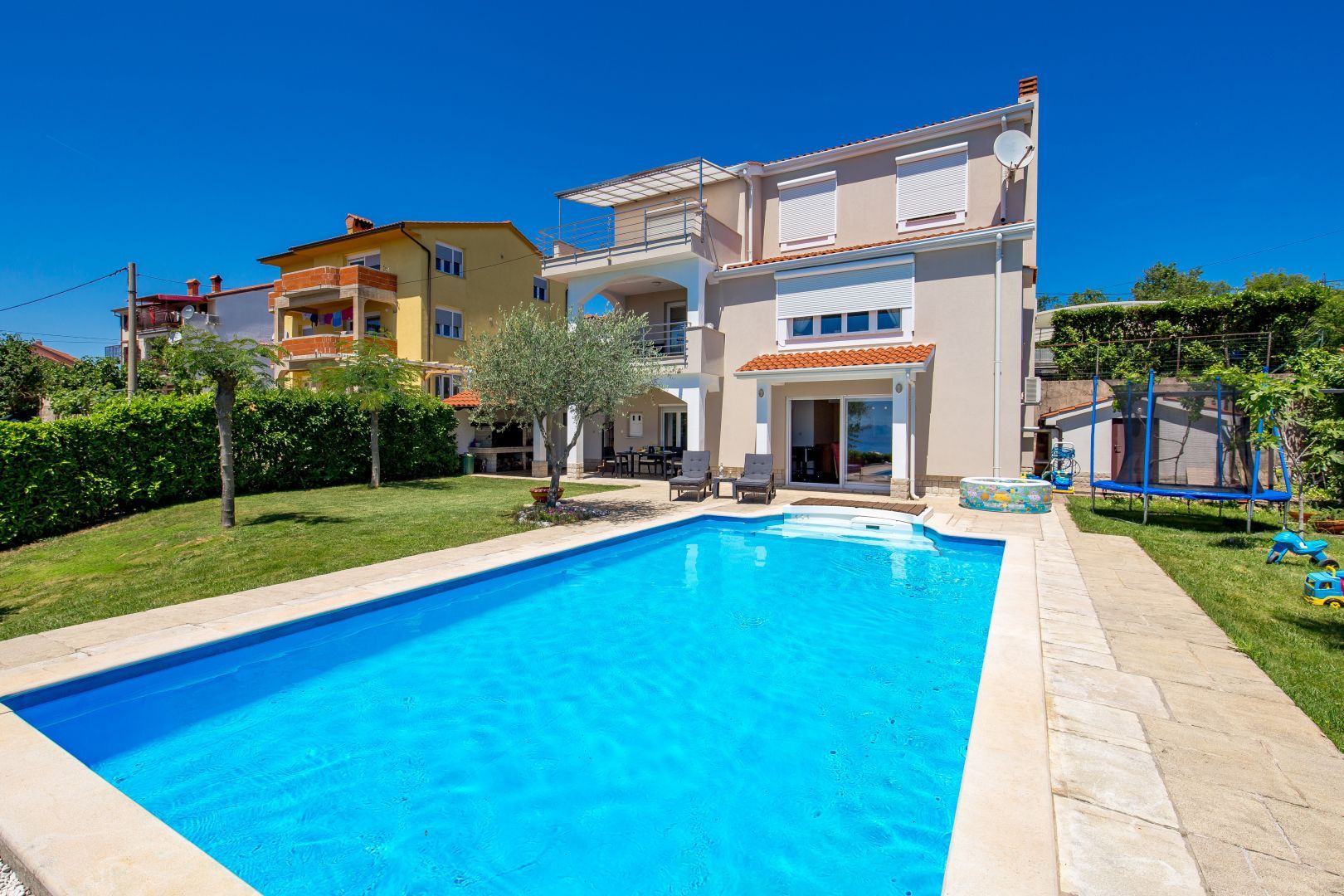Viškovo, Marinići - rodinný dům se dvěma apartmány a bazénem Prodáme dům v Marinići, novější, kvalitnější stavby s upraveným dvorem a bazénem, asi 10 minut jízdy od centra města. Plocha pozemku je 989 m2, plocha domu 316 m2. Dům se skládá ze dvou bytů. Jeden apartmán je v přízemí 78 m2 a skládá se z jedné ložnice, obývacího pokoje, kuchyně a koupelny. Byt vede do dvora, kde je místo pro společenské vyžití, gril a bazén. Byt je kategorizován a může být použit pro turistické účely. Druhá strana je přístupná z horní strany, kde je parkoviště a garáž. Byt se rozkládá na dvou podlažích o celkové ploše 238 m2. V přízemí se nachází velký obývací pokoj, kuchyň a jídelna se vstupem na balkon, jedna ložnice, koupelna, prostor se saunou a mini tělocvičnou. Vnitřní schodiště vede do patra, kde jsou 4 ložnice, koupelna a šatna a z hlavní místnosti se vchází na balkon. V upravené zahradě je venkovní krb, dětské hřiště a zahradní domek. Vynikající nemovitost na skvělém místě s krásným výhledem na Kvarner a moře, s ohledem na dva samostatné apartmány vhodné pro různé účely.