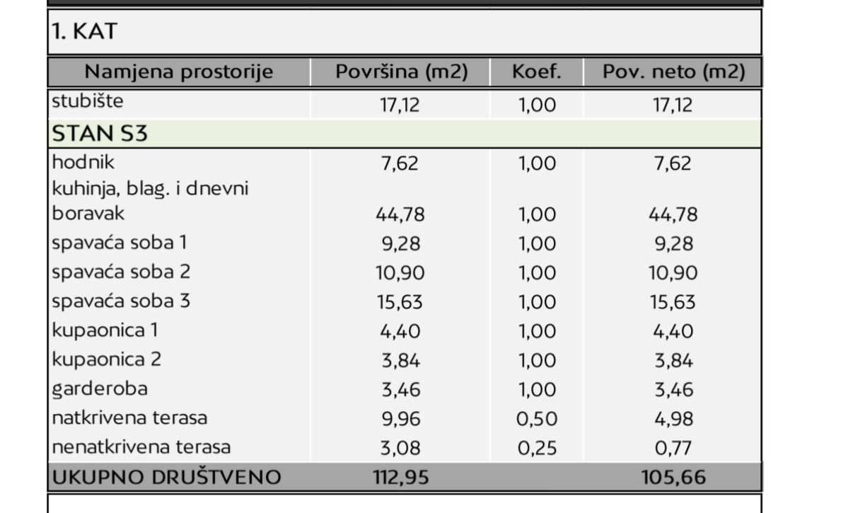 ZADAR, BIBINJE - Třípokojový apartmán v atraktivní lokalitě S3 Na prodej je moderní třípokojový apartmán v prvním patře novostavby nacházející se v mimořádně atraktivní lokalitě v Bibinje, jen pár minut chůze od moře a pláže. Budova byla postavena podle nejvyšších stavebních standardů s použitím kvalitních materiálů a moderních technologií, se zvláštním důrazem na komfort, energetickou účinnost a moderní design. Apartmán má čistou plochu 108,16 m² (hrubá 115,45 m²) a skládá se z prostorného, slunného obývacího pokoje s kuchyní a jídelnou o rozloze 44,78 m², tří ložnic, dvou koupelen, šatny, chodby a terasy s krásným výhledem na moře o rozloze 14,04 m². Apartmán má také vlastní parkovací místo. Apartmán vyniká svou výjimečnou vzdušností a dostatkem přirozeného světla a díky své vynikající orientaci a otevřenému výhledu na moře poskytuje pocit pohodlí a luxusu. Celý apartmán má podlahové vytápění a každý pokoj má vlastní klimatizaci. Při stavbě byly použity nejkvalitnější materiály – cihlový termoblok, 10 cm silná fasádní tepelná izolace, keramická dlažba, PVC a ALU truhlářské práce s elektrickými roletami a moskytiérami a vstupní dveře odolné proti vloupání a požáru. Předpokládané nastěhování je plánováno na květen 2026. Budova se nachází na mimořádně výhodném místě, v blízkosti veškeré důležité občanské vybavenosti – obchodů, škol, restaurací, dálnic, letišť a přístavů a Mariny Dalmacija, největšího přístavu na Jadranu s více než 1400 kotvišti. Bibinje je turistické letovisko ležící 6 kilometrů jihovýchodně od Zadaru, známé svým 4kilometrovým pobřežím, promenádami a krásnými plážemi.