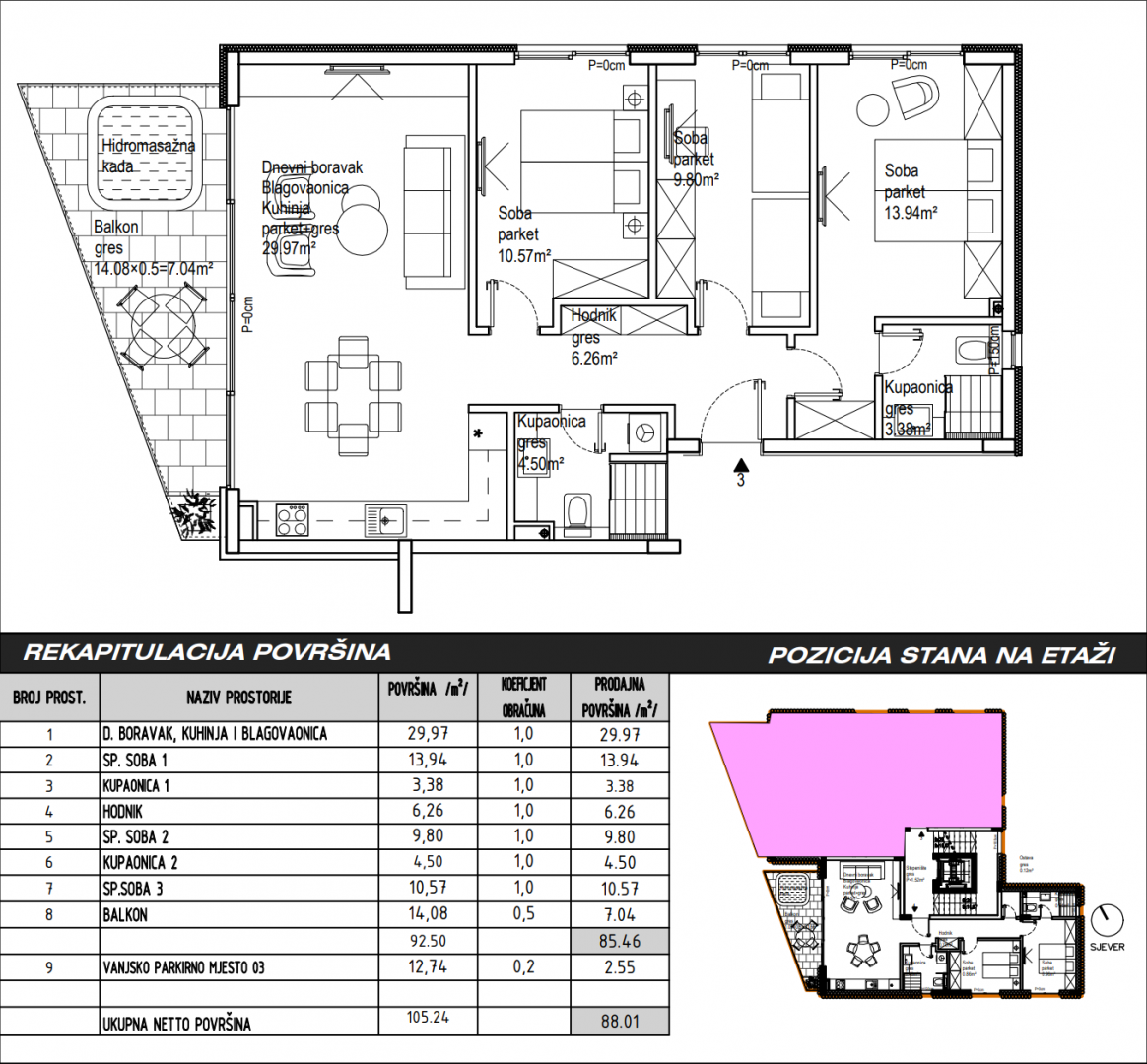 ZADAR, SUKOŠAN - Luxusní byt ve výstavbě u moře S03A Prodává se luxusní byt ve výstavbě, který se nachází v exkluzivní lokalitě u moře v Sukošanu nedaleko Zadaru. Byt se nachází v menším bytovém domě se šesti jednotkami v luxusním novostavebním komplexu. Byt o celkové obytné ploše 88,01 m2 se nachází v prvním patře a skládá se z obývacího pokoje, kuchyně a jídelny, tří ložnic, dvou koupelen, balkonu a jednoho parkovacího místa. Celková užitná plocha bytu spolu s veškerým příslušenstvím je 105 m2. V přízemí se nachází společný bazén pro všechny nájemníky. Garážové stání a úložný prostor v suterénu budovy za příplatek. Byt je plně klimatizován a koupelna má podlahové vytápění. Při stavbě byly použity vysoce kvalitní materiály, jako je tepelná izolace na fasádě z kamenné vlny, PVC truhlářství s trojsklem, elektrické rolety a moskytiéry. Plánovaný termín dokončení výstavby je polovina roku 2026. Sukošan je malé přímořské město nedaleko Zadaru, které má také přístav, což z něj činí skutečný ráj pro jachtaře. V okolí se nachází mnoho dalších malebných přímořských měst, jako jsou Bibinje, Turanj nebo historické město Biograd na Moru. Městské centrum, město Zadar, je vzdálené 15 km a nejbližší letiště je od nemovitosti vzdálené pouhých 10 km. Jeho výhodná poloha v centru severní Dalmácie poskytuje přístup k četným ostrovům v zadarském akvatoriu a také blízkost různých národních parků a přírodních parků. Nedaleko se nachází například Přírodní park Vranské jezero a Národní park Kornati, souostroví působivé geografie, které zahrnuje 89 ostrovů, ostrůvků a útesů. „