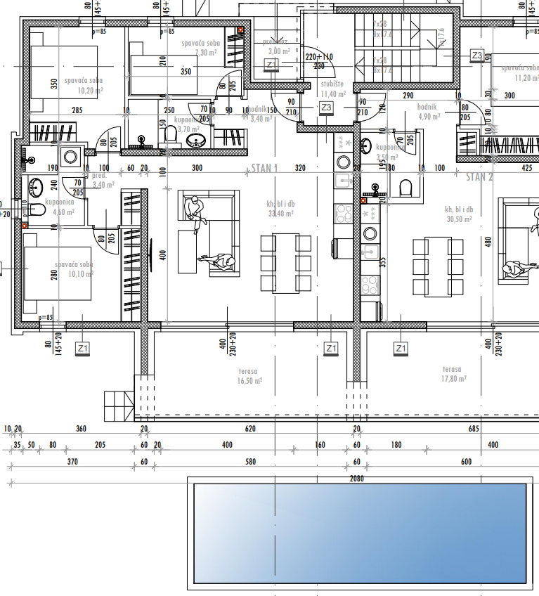 ZADAR, SUKOŠAN - Špičková novostavba! Podlahové vytápění, vyhřívaný bazén, 120 metrů od moře...! S1 Na prodej jsou nové, moderní apartmány v krásném Sukošanu, v budově s celkem šesti bytovými jednotkami, ideální pro klidný život nebo jako investice k dovolené a pronájmu. Každý apartmán má tři ložnice, dvě koupelny, pohodlný obývací pokoj, jídelnu a kuchyň a prostornou terasu pro užívání si čerstvého vzduchu. Budova je vzdálena pouhých 120 metrů od pláže - jen tři minuty chůze k moři. V přízemí se nachází společný vyhřívaný bazén o rozloze 30 m2, ideální pro relaxaci po celý rok, zatímco kolem budovy je zelená zahrada, která poskytuje pocit soukromí a klidu. Každý apartmán má vlastní úložný prostor a penthousy mají navíc exkluzivní střešní terasy s panoramatickým výhledem. Apartmány v prvním a druhém patře také nabízejí krásný výhled na moře. Komfort a kvalita výstavby jsou na nejvyšší úrovni: podlahové vytápění v celém bytě, klimatizace v každé místnosti, elektrické rolety, moskytiéry... Dokončení výstavby je plánováno do konce roku 2026 a jelikož je majitelem právnická osoba, kupující neplatí daň z nemovitosti. Sukošan je okouzlující dalmatské městečko známé svými písečnými plážemi, čistým mořem a přístavy, ideální pro milovníky klidného života u moře. Nachází se pouhých 10 minut jízdy od Zadaru - historického města s bohatým kulturním dědictvím, špičkovou gastronomií a pulzující atmosférou po celý rok. Pro více informací a prohlídku nás neváhejte kontaktovat - najděte si svůj ideální domov u moře v Sukošanu!