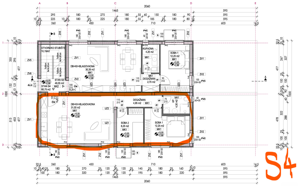 ZADAR, VRSI MULO - Novostavba v žádané lokalitě! 2S+DB! S4 Na prodej je novostavba nacházející se v žádané klidné lokalitě v městečku Vrsi Mulo, pouhých 4-5 minut chůze od krásných, upravených oblázkových pláží. V budově se nacházejí 4 apartmány, 2 v přízemí a 2 v prvním patře. Apartmány v přízemí mají zahradu a nekrytou terasu s výhledem na les, tedy na pozemek, kde není povolena výstavba, zatímco apartmány v prvním patře mají prostornou střešní terasu s výhledem na moře. S1 a S3 mají jednu ložnici, obývací pokoj a koupelnu, zatímco S2 a S4 mají dvě ložnice, obývací pokoj a koupelnu. Apartmány jsou vybaveny klimatizací v obývacím pokoji a ložnicích, tesařské práce jsou z PVC s moskytiérami, žaluzie jsou elektrické na posuvné stěně, zatímco ostatní okna mají běžné žaluzie. Každý apartmán má vlastní parkovací místo, přičemž další dvě parkovací místa jsou k dispozici, která lze zakoupit za příplatek. Majitel je právnická osoba a kupující je osvobozen od placení daně z nemovitosti. Plánované dokončení výstavby je do léta 2026. Vrsi Mulo je příjemné turistické letovisko známé svými krásnými plážemi, kavárnami, restauracemi a dalším vybavením. Nedaleko se nacházejí pláže Ričine, Duboka Draga, Zečevo a mnoho dalších. Zadar je vzdálen asi 20 minut jízdy autem a nejstarší chorvatské královské město Nin je vzdálené asi 5 km. Nečekejte, zavolejte nám hned a domluvte si prohlídku této fantastické nemovitosti!