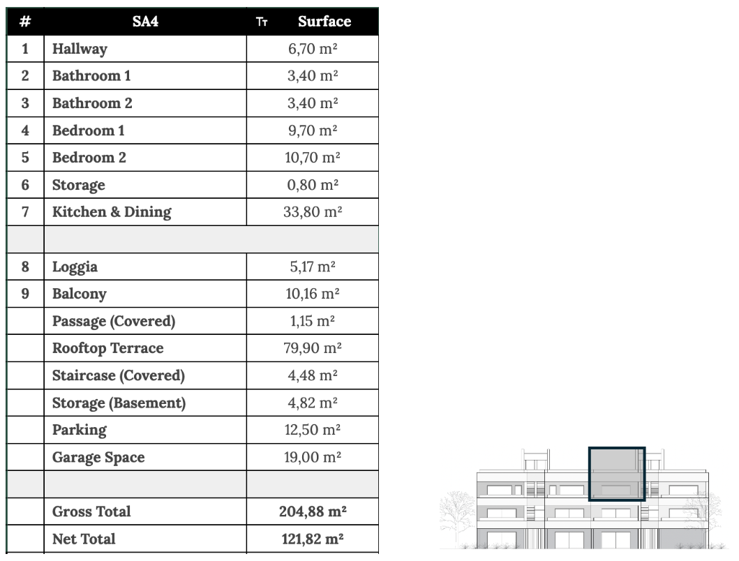 ZADAR, ZATON - Penthouse s krásným výhledem 95 metrů od moře! SA4. Pouhých 95 metrů od moře, v klidném městečku Zaton, se staví moderní projekt s devíti luxusními apartmány, které se nacházejí v uzavřeném resortu s rampou u vjezdu. Osada je navržena jako soukromá oáza, skládající se z pěti budov, kde si obyvatelé užívají naprostého bezpečí a soukromí. Apartmány v horních patrech mají prostorné střešní terasy s krásným výhledem na moře a ostrovy, zatímco jednotky v přízemí mají vlastní zahrady. Za příplatek je také možné zakoupit plně zařízené apartmány. Zvláštní pozornost byla věnována interiérovému designu, moderním technologickým řešením a kvalitním materiálům, aby byl dům funkční, bezpečný a pohodlný. Systém chytré domácnosti umožňuje ovládání osvětlení, klimatizace a vytápění a konstrukce je provedena s železobetonovou konstrukcí s 10 cm tepelnou izolací. Součástí standardního vybavení jsou hliníkové truhlářské výrobky s elektrickými roletami, multisplitové klimatizace, podlahové vytápění v koupelnách a obývacím pokoji, videovrátný, kamerový systém a protipožární dveře. Byla použita prvotřídní sanitární keramika a podlahové krytiny od renomovaných výrobců. Plánované dokončení prací je do konce roku 2025. Penthouse SA4 se nachází ve druhém patře a skládá se ze dvou ložnic, dvou koupelen, úložné místnosti a prostorného obývacího pokoje s kuchyní a jídelnou. Jeho zvláštní výhodou je střešní terasa s krásným výhledem na moře a parkovací místo v garáži. Zaton je klidné dalmatské městečko známé svým křišťálově čistým mořem, oblázkovými plážemi a uvolněnou středomořskou atmosférou, zatímco nedaleko se nachází Zadar - město bohaté na historii, kulturní památky a špičkové restaurace, ideální destinace pro bydlení i dovolenou. Prodávající je právnická osoba a kupující neplatí daň z nemovitosti. Pro veškeré další informace a pro domluvení prohlídky nás neváhejte kontaktovat.