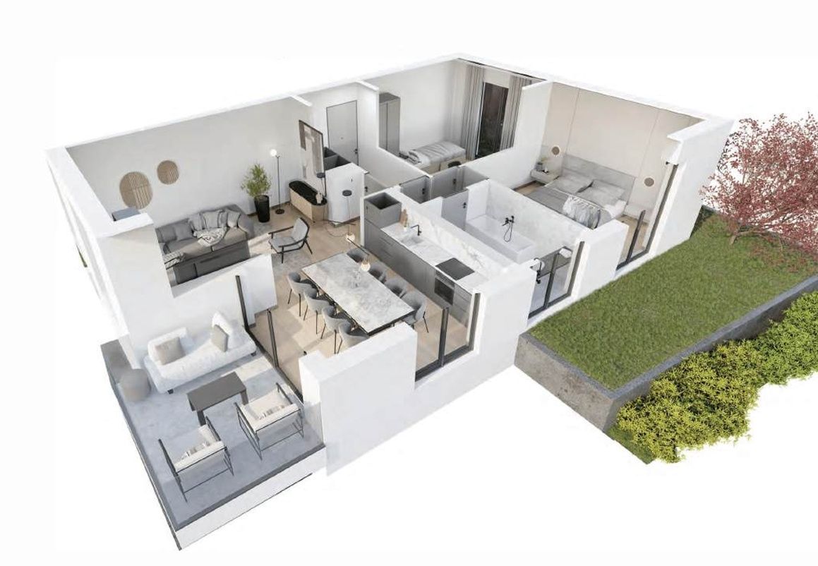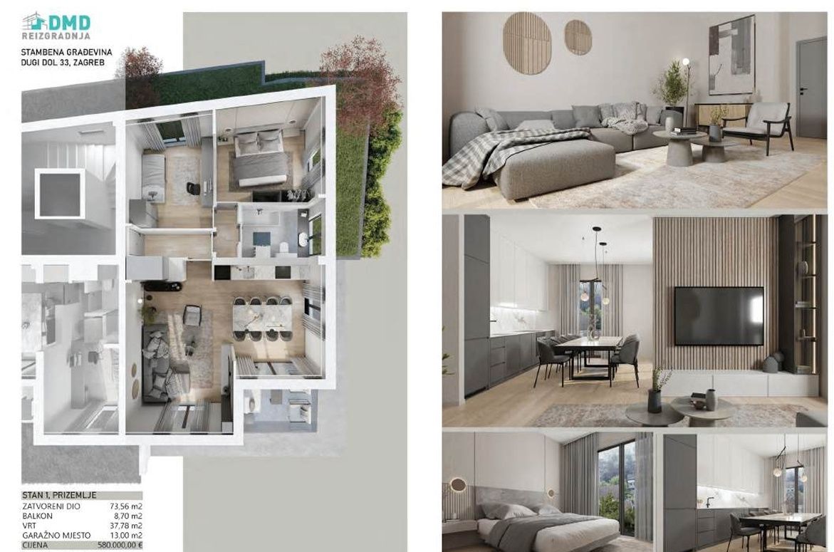 ZÁHREB, SREBRNJAK - moderní třípokojový byt v klidné lokalitě V klidné a zelené lokalitě, jen pár minut jízdy od centra města, se nachází moderní rezidenční projekt ve výstavbě s plánovaným nastěhováním v prvním čtvrtletí roku 2026. V bezprostřední blízkosti se nachází veškerá občanská vybavenost potřebná pro pohodlný život - škola, školka, obchody, veřejná doprava, parky a promenády. Byt o celkové rozloze 73,56 m² se nachází v přízemí budovy s výtahem. Půdorys je mimořádně funkčně řešen s důrazem na pohodlí, vzdušnost a dostatek přirozeného světla. Skládá se z obývacího pokoje s jídelnou a kuchyní, dvou ložnic, koupelny a chodby a balkonu o rozloze 8,70 m², který poskytuje ideální prostor pro trávení času venku a relaxaci v soukromí vašeho domova. K bytu náleží také garážové stání o rozloze 15,55 m² a úložný prostor v suterénu. Budova byla postavena podle nejvyšších standardů energetické účinnosti (certifikát A+). Investor používá nejkvalitnější materiály: PVC truhlářské výrobky s trojitým argonovým sklem, dveře odolné proti vloupání a požáru, dubové parkety, keramiku 1. třídy a protiskluzovou dlažbu na terasách a balkonech. Vytápění a chlazení zajišťuje tepelné čerpadlo s podlahovým vytápěním a veškeré instalace (elektřina, voda, plyn) jsou oddělené. Byty jsou vybaveny kondenzačním kotlem, tichým větráním, moskytiérami, optickým kabelem a klimatizací. Byt je navržen tak, aby poskytoval maximální funkčnost a komfort, a spojení s přírodou prostřednictvím vlastní zahrady z něj činí ideální volbu pro klidný rodinný život.